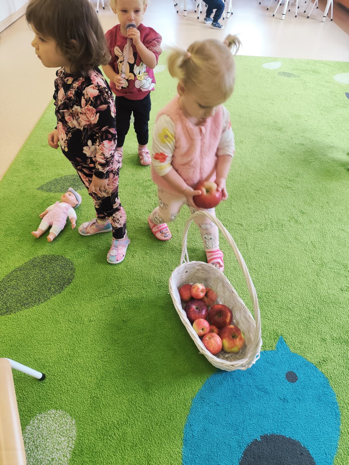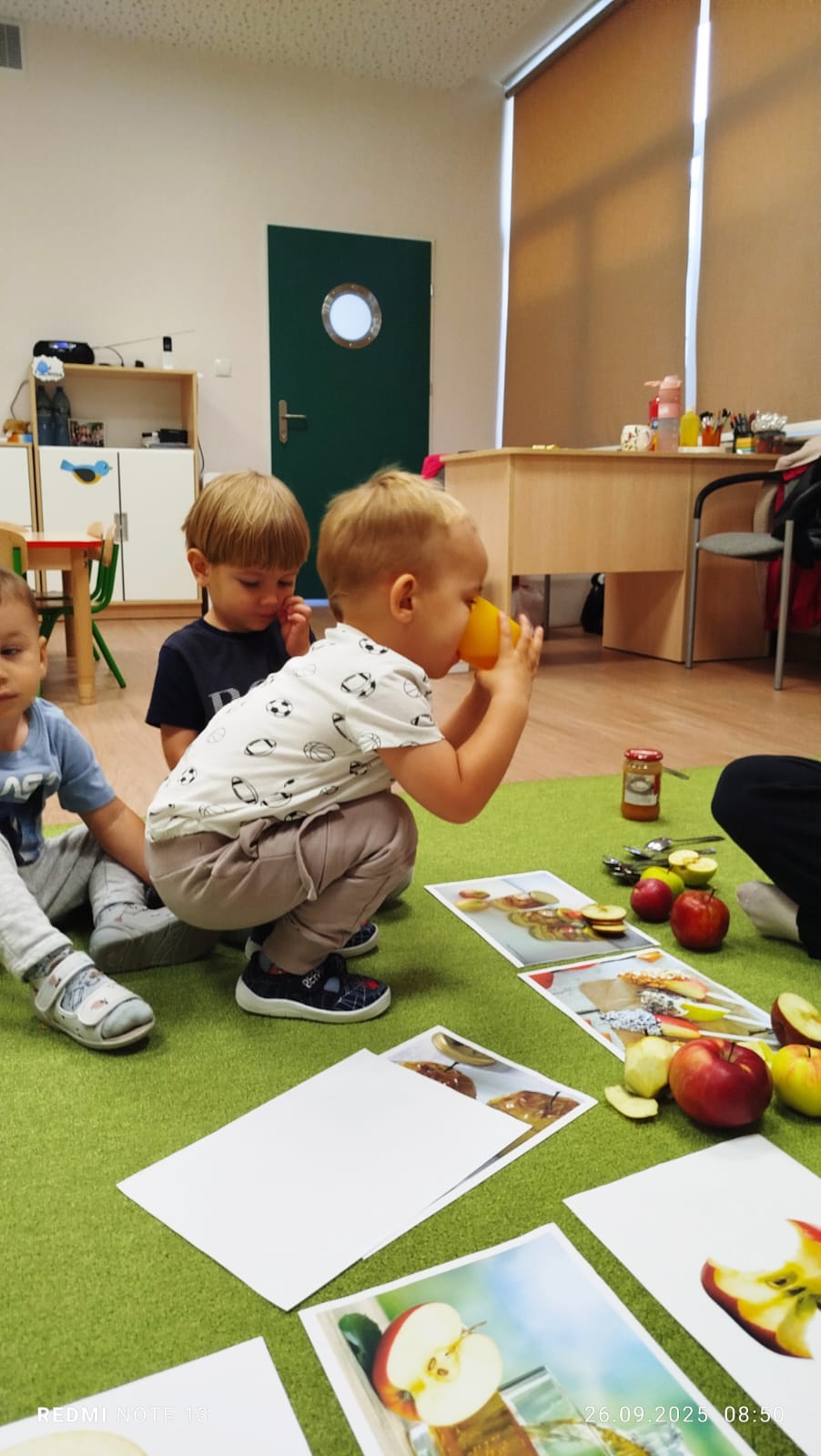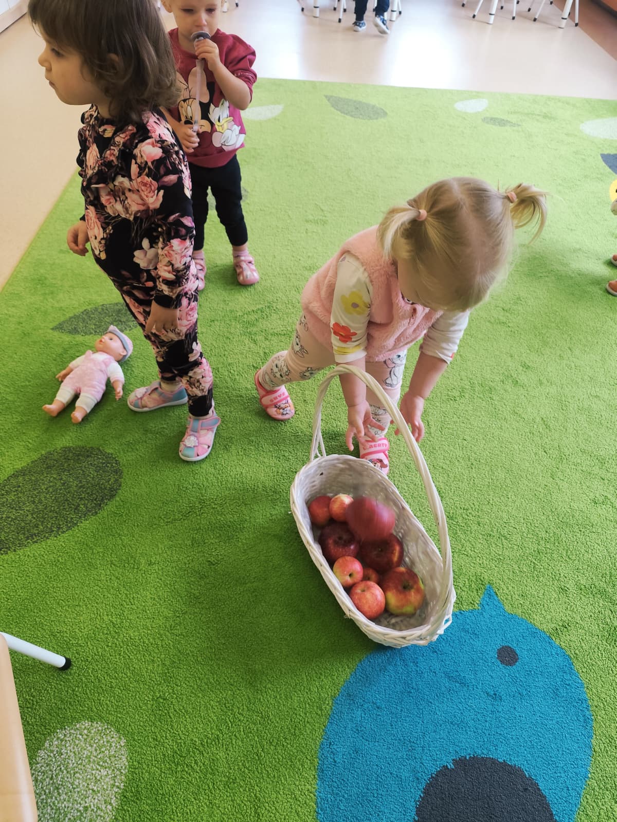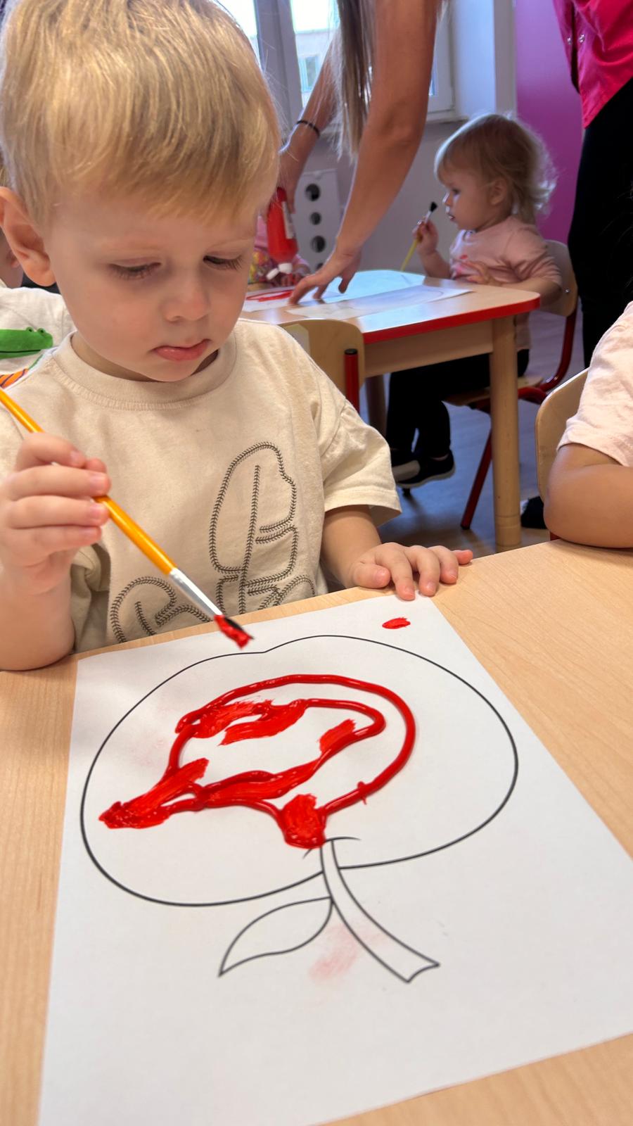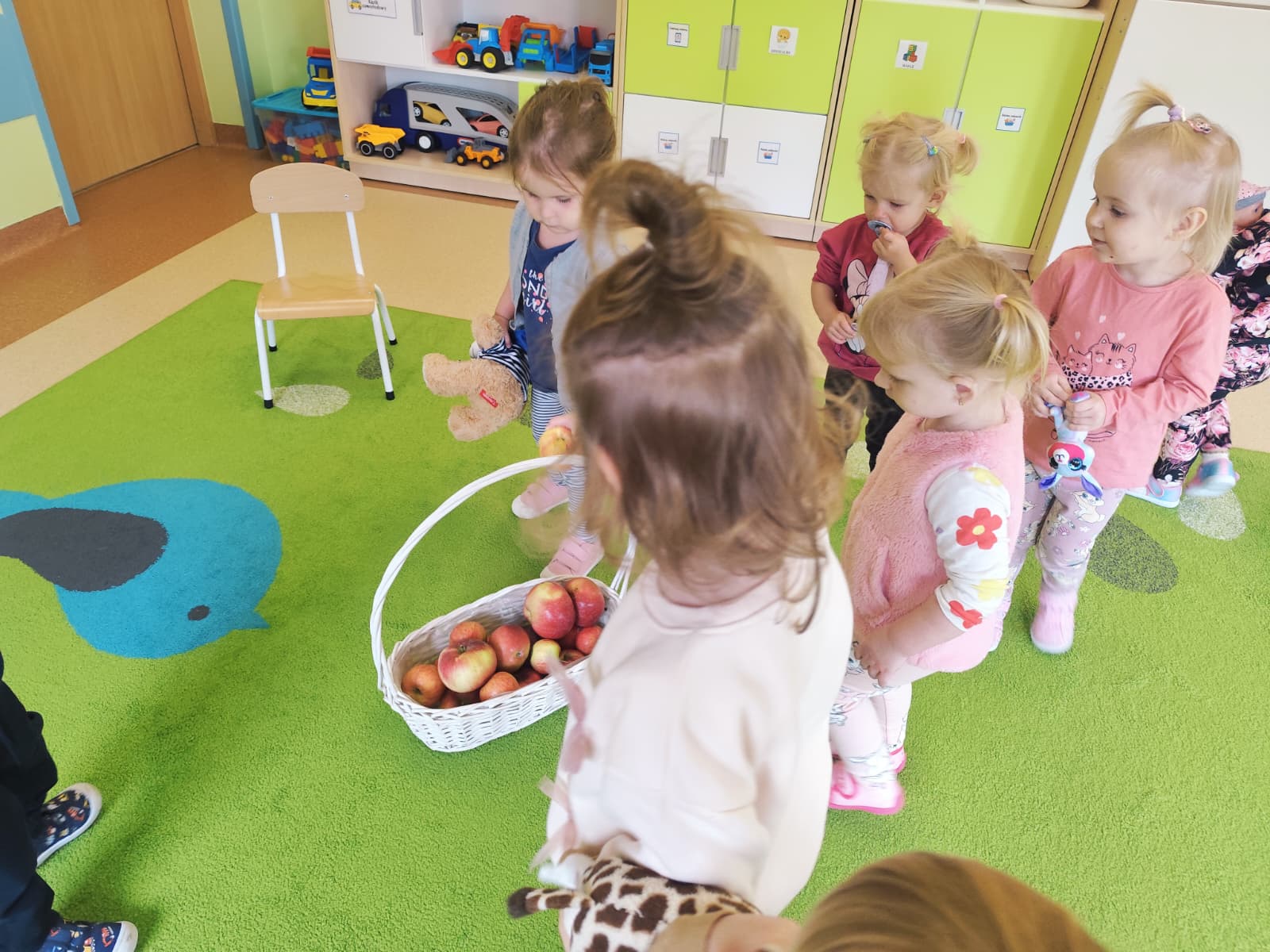 Nie zabrakło wspólnych zabaw plastycznych – maluchy tworzyły kolorowe prace z motywem jabłka. Były też wesołe piosenki i zabawy ruchowe związane z tym pysznym owocem. Największą atrakcją okazała się degustacja – dzieci chrupały świeże jabłka, piły sok jabłkowy i próbowały musu jabłkowego. Dzięki temu mogły się przekonać, że jabłko można podawać na wiele różnych sposobów.