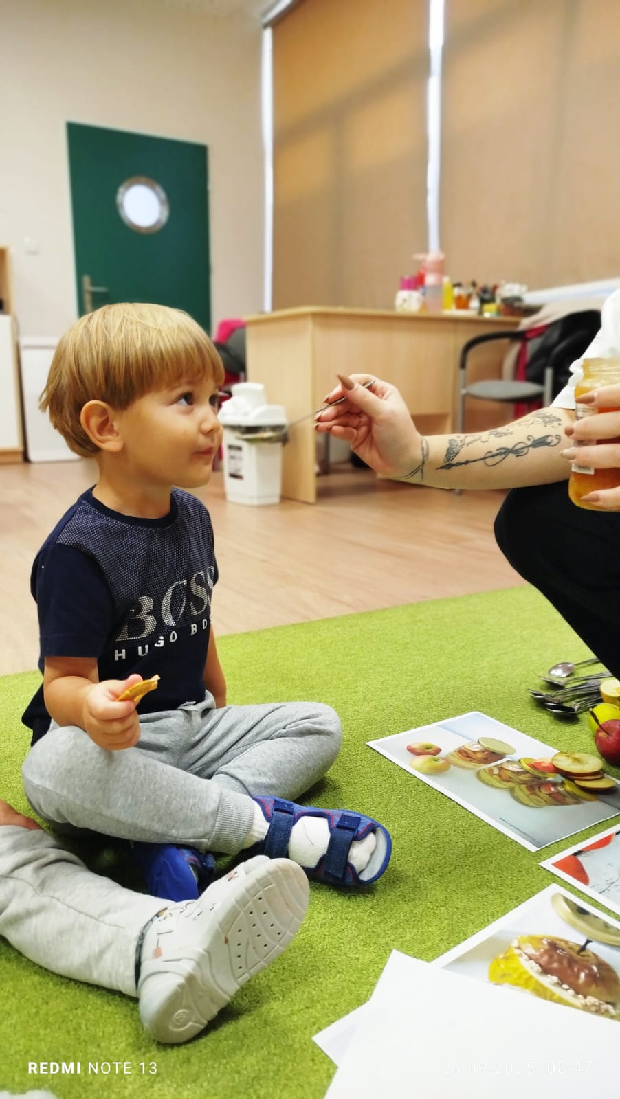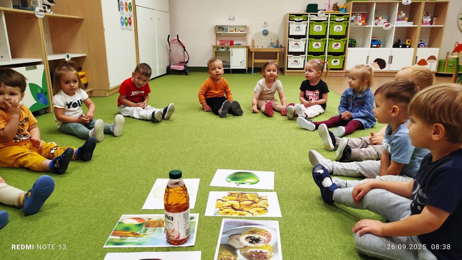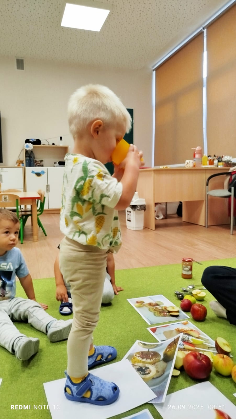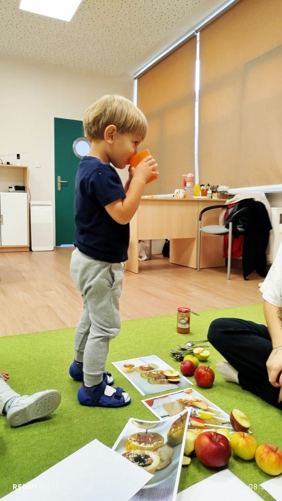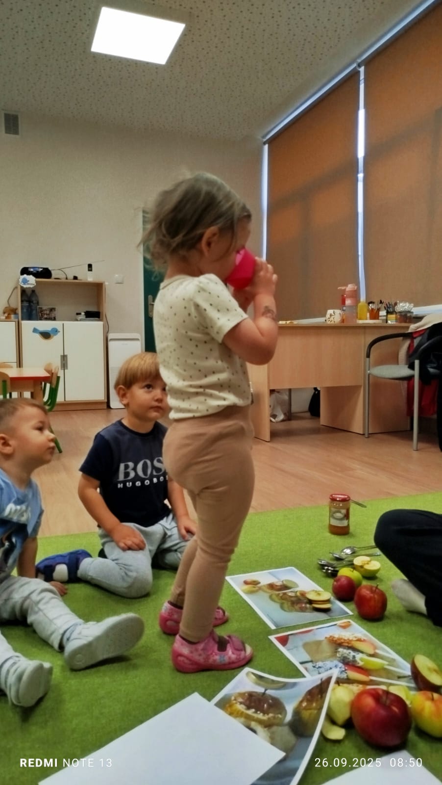 Nie zabrakło wspólnych zabaw plastycznych – maluchy tworzyły kolorowe prace z motywem jabłka. Były też wesołe piosenki i zabawy ruchowe związane z tym pysznym owocem. Największą atrakcją okazała się degustacja – dzieci chrupały świeże jabłka, piły sok jabłkowy i próbowały musu jabłkowego. Dzięki temu mogły się przekonać, że jabłko można podawać na wiele różnych sposobów.