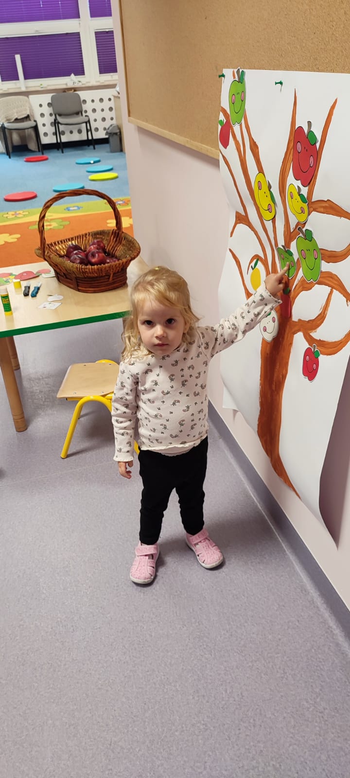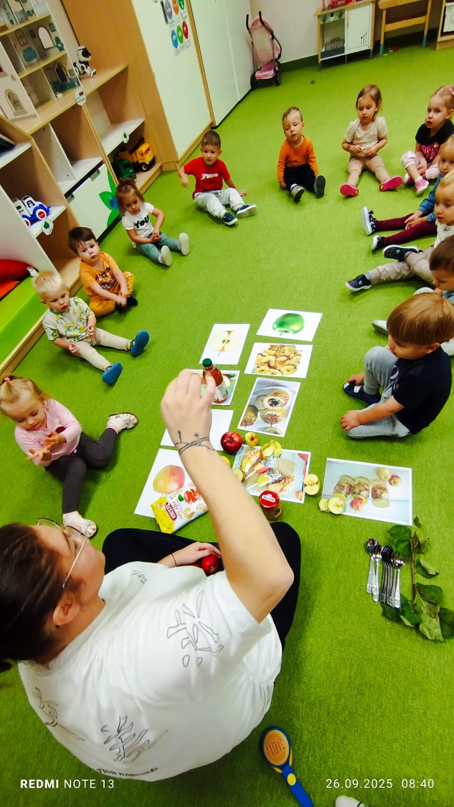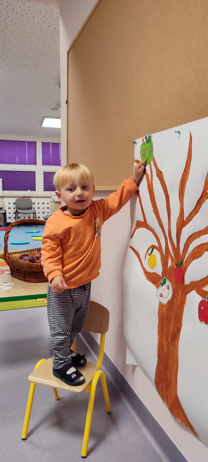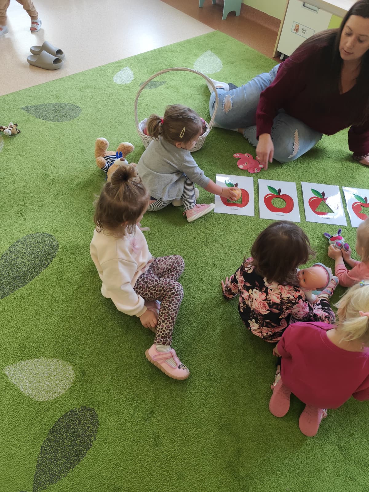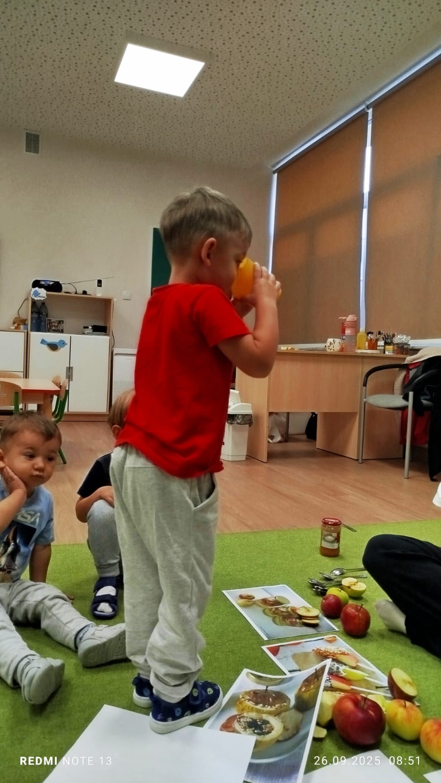 Nie zabrakło wspólnych zabaw plastycznych – maluchy tworzyły kolorowe prace z motywem jabłka. Były też wesołe piosenki i zabawy ruchowe związane z tym pysznym owocem. Największą atrakcją okazała się degustacja – dzieci chrupały świeże jabłka, piły sok jabłkowy i próbowały musu jabłkowego. Dzięki temu mogły się przekonać, że jabłko można podawać na wiele różnych sposobów.