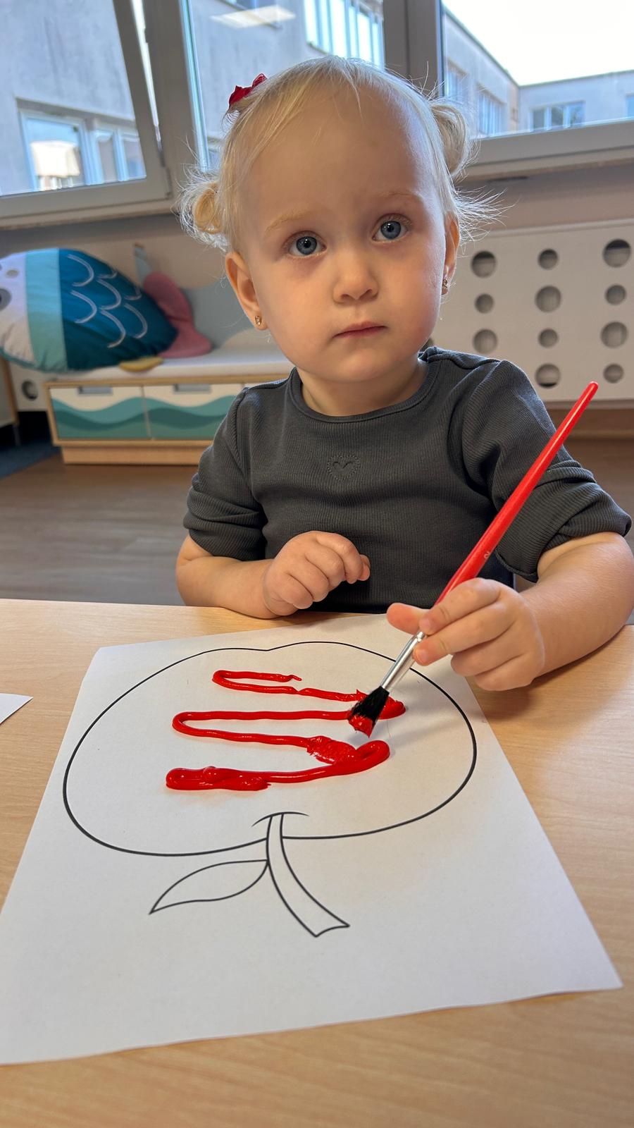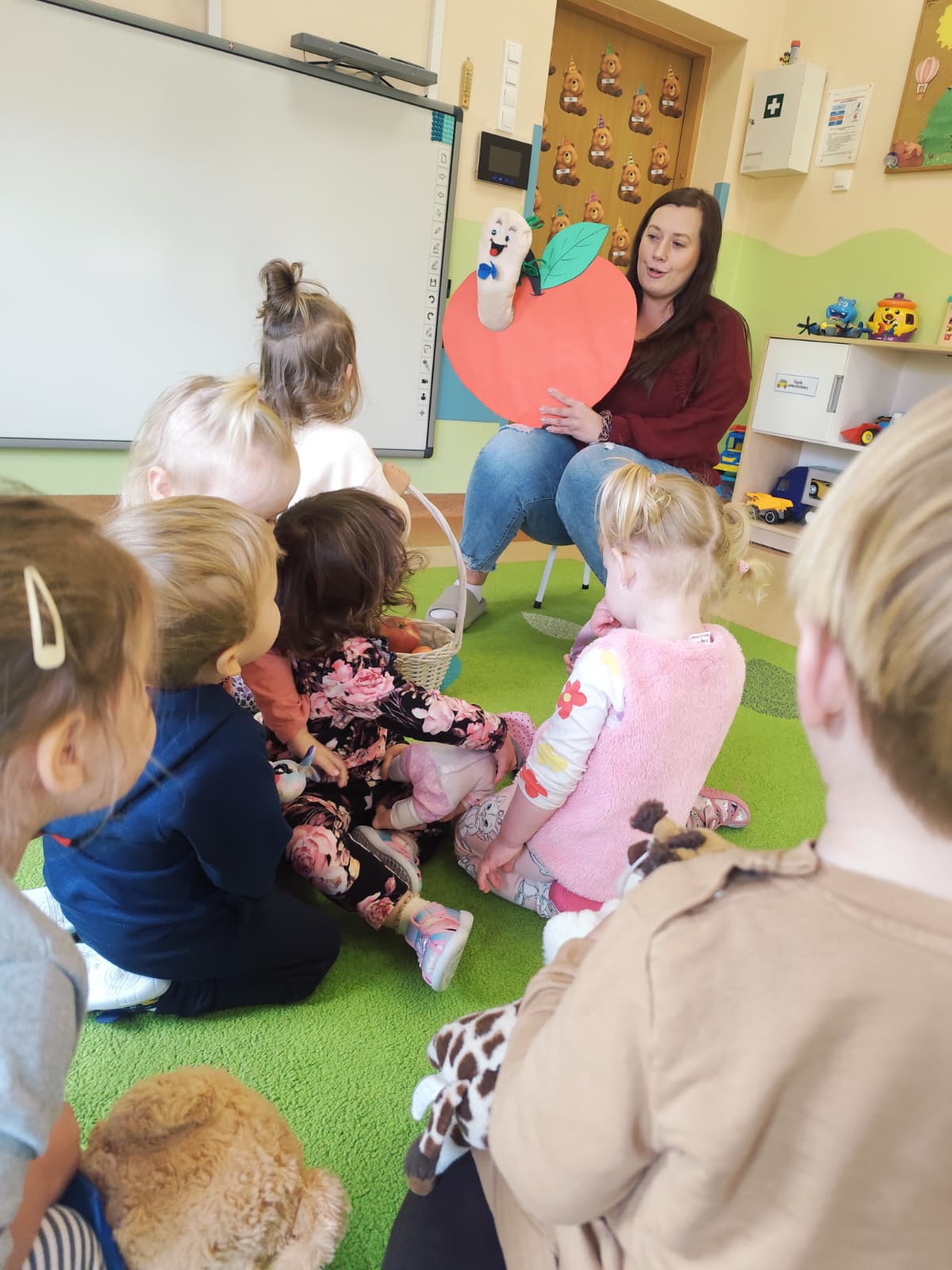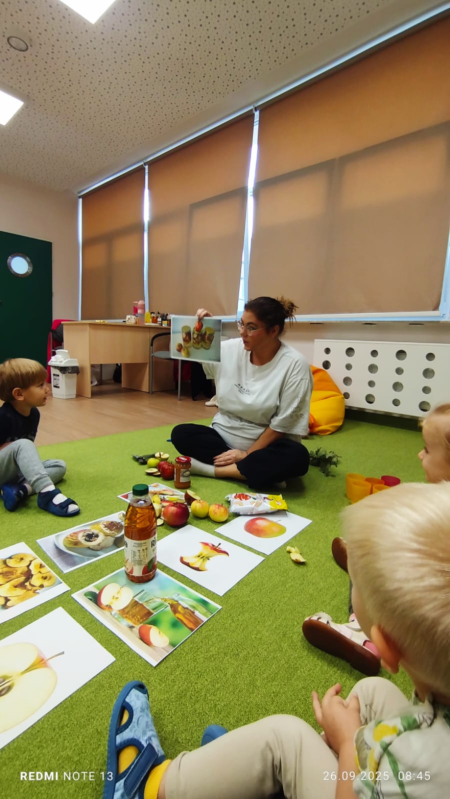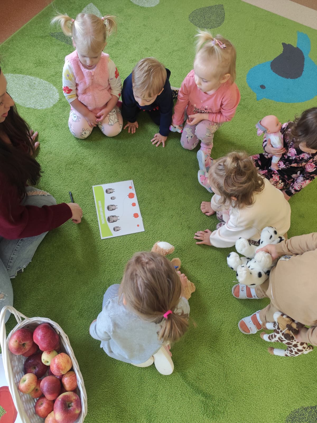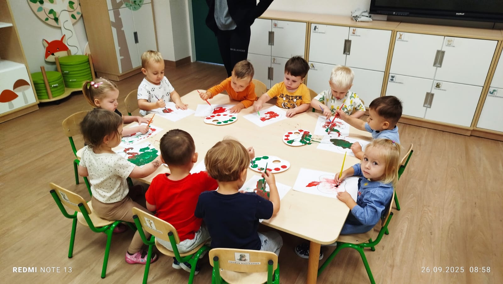 Nie zabrakło wspólnych zabaw plastycznych – maluchy tworzyły kolorowe prace z motywem jabłka. Były też wesołe piosenki i zabawy ruchowe związane z tym pysznym owocem. Największą atrakcją okazała się degustacja – dzieci chrupały świeże jabłka, piły sok jabłkowy i próbowały musu jabłkowego. Dzięki temu mogły się przekonać, że jabłko można podawać na wiele różnych sposobów.