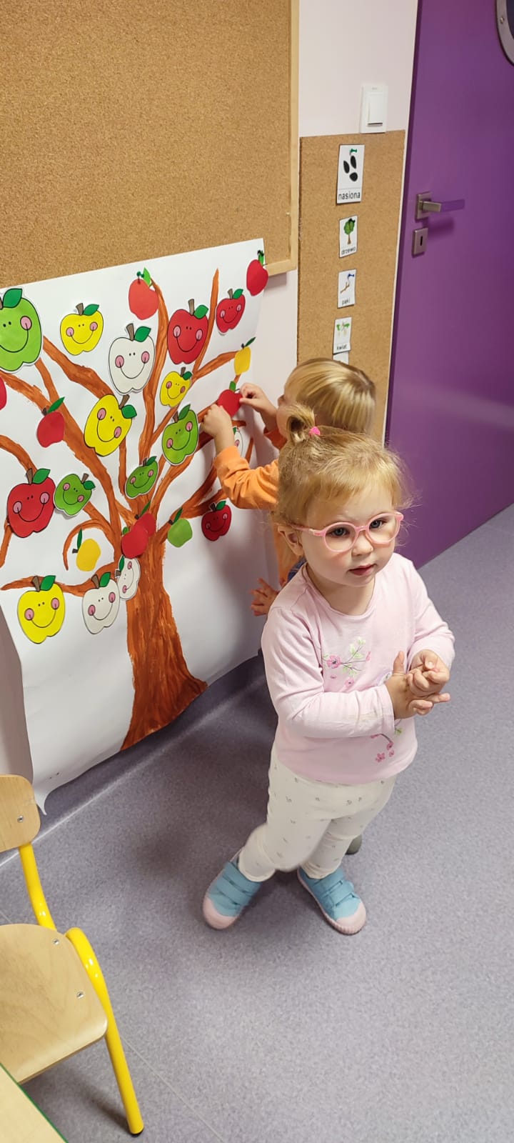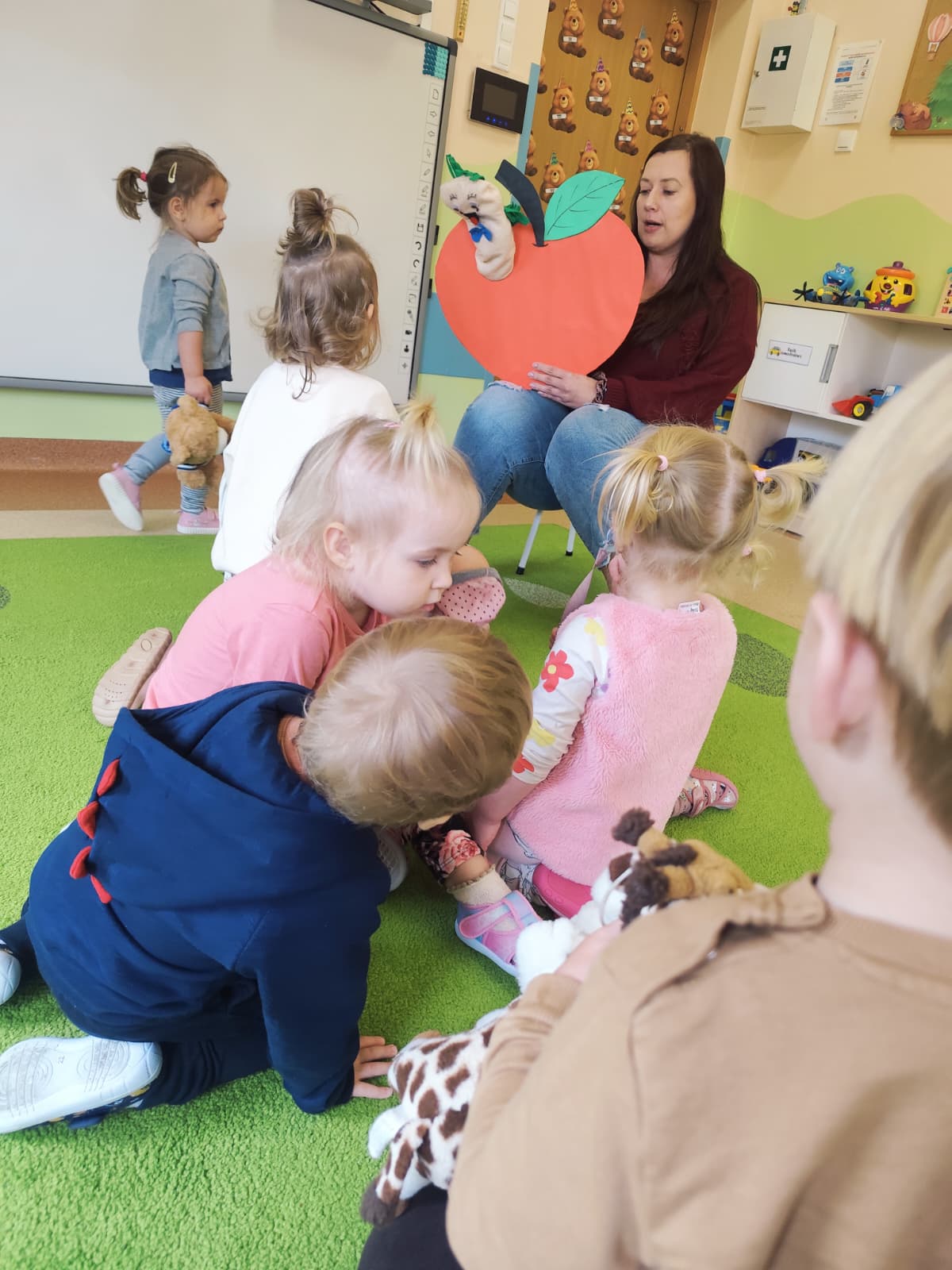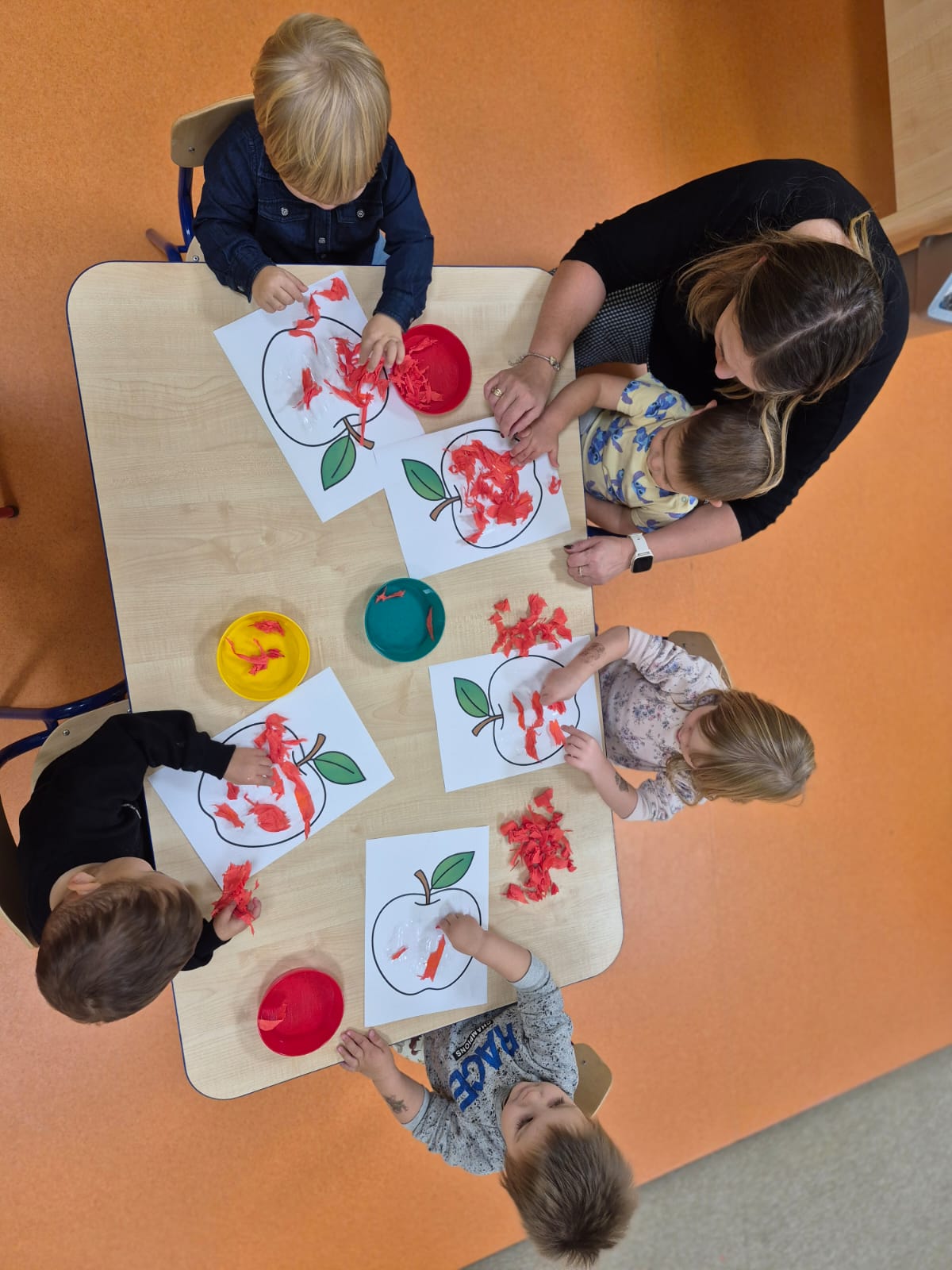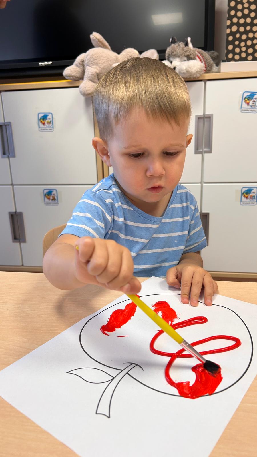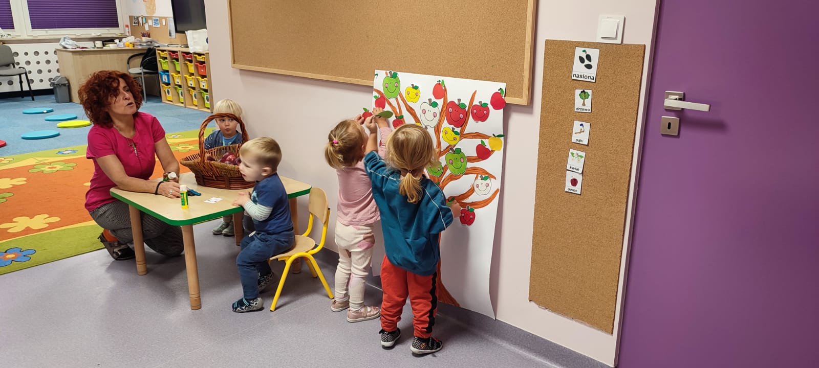 Nie zabrakło wspólnych zabaw plastycznych – maluchy tworzyły kolorowe prace z motywem jabłka. Były też wesołe piosenki i zabawy ruchowe związane z tym pysznym owocem. Największą atrakcją okazała się degustacja – dzieci chrupały świeże jabłka, piły sok jabłkowy i próbowały musu jabłkowego. Dzięki temu mogły się przekonać, że jabłko można podawać na wiele różnych sposobów.