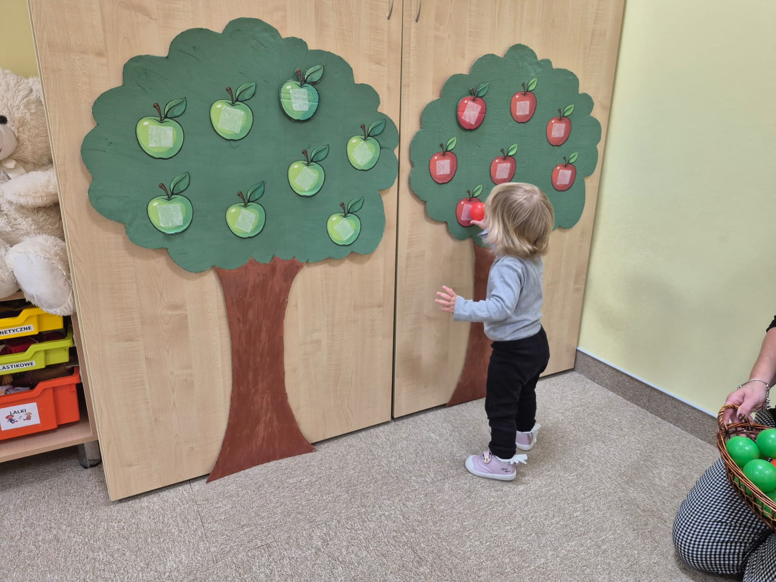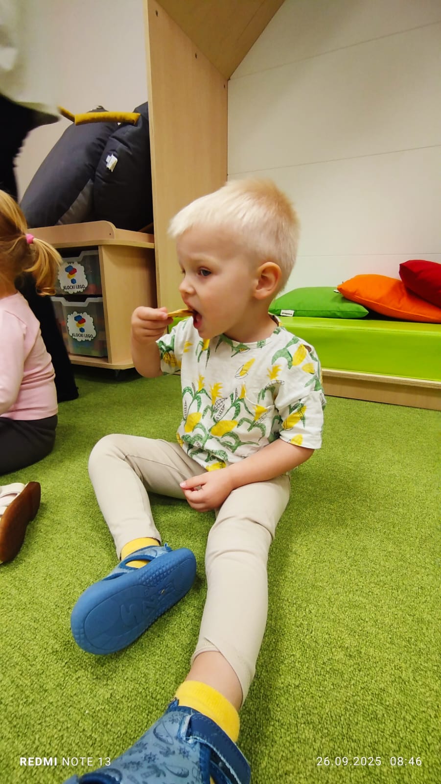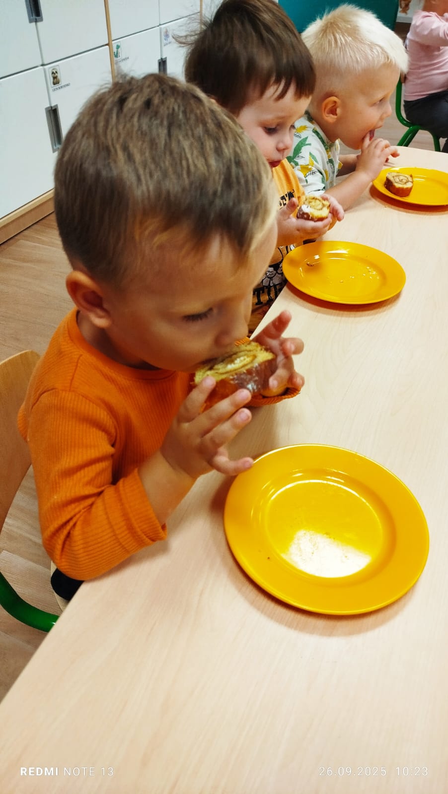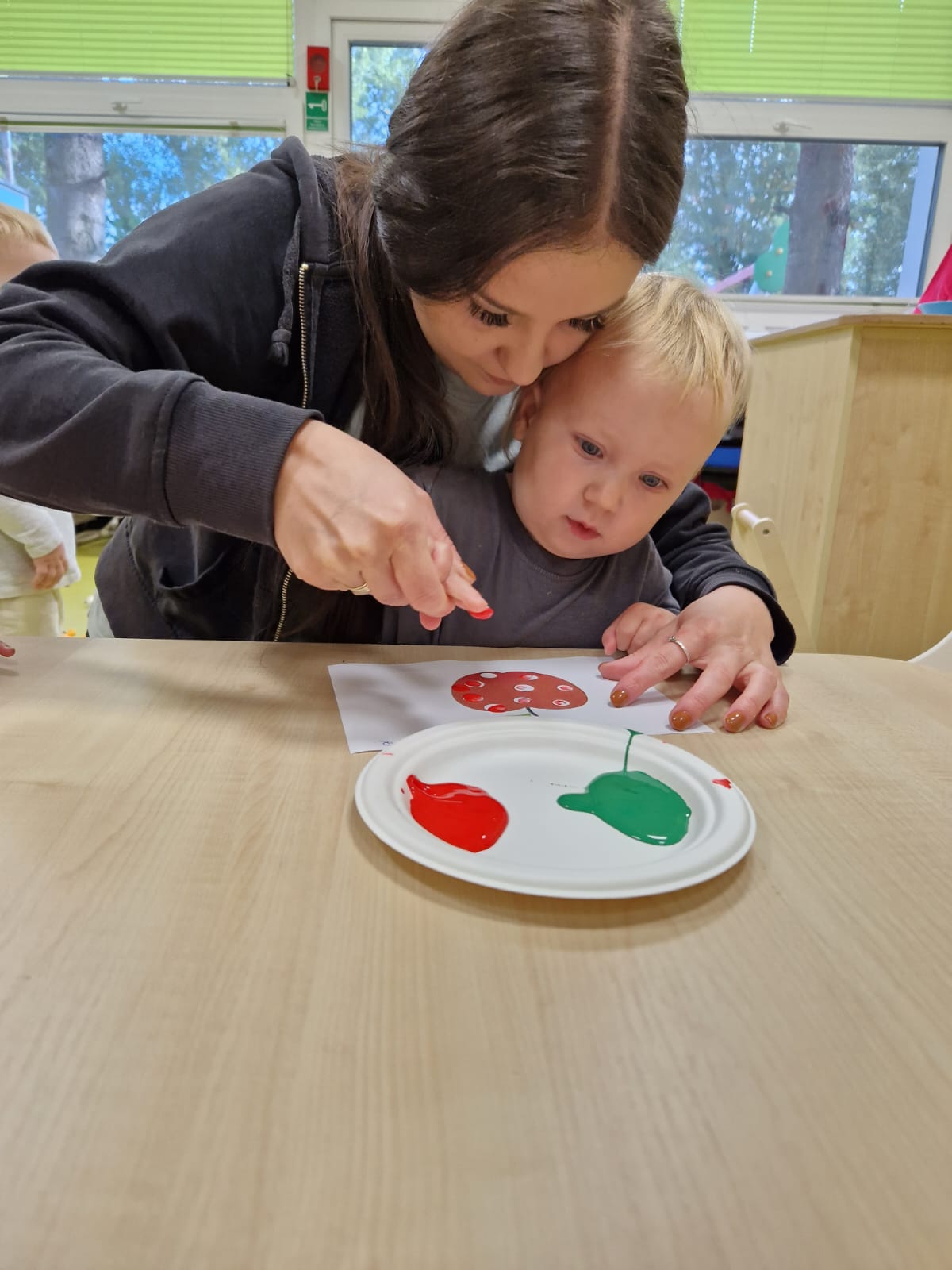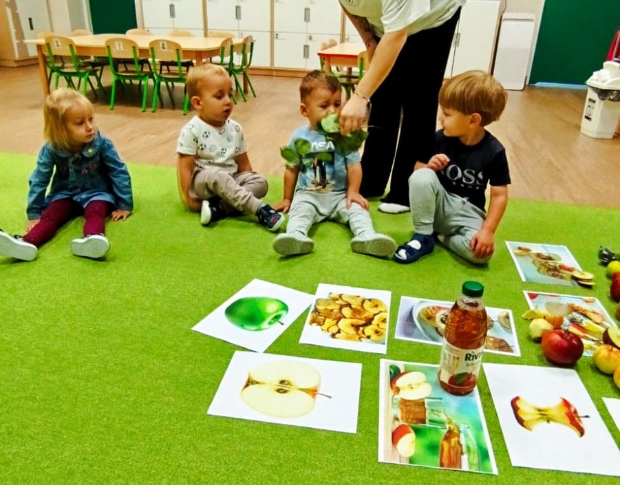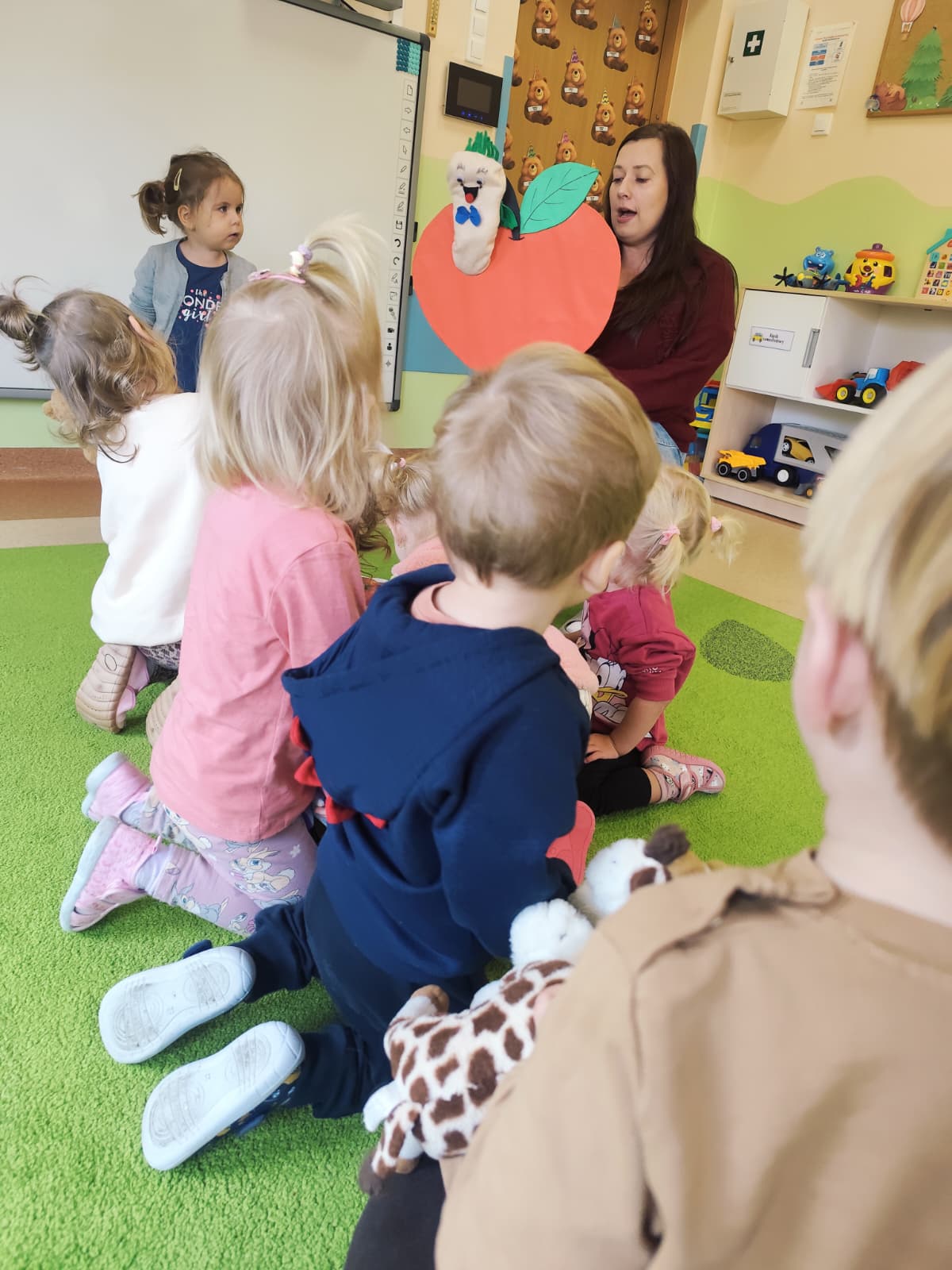 Nie zabrakło wspólnych zabaw plastycznych – maluchy tworzyły kolorowe prace z motywem jabłka. Były też wesołe piosenki i zabawy ruchowe związane z tym pysznym owocem. Największą atrakcją okazała się degustacja – dzieci chrupały świeże jabłka, piły sok jabłkowy i próbowały musu jabłkowego. Dzięki temu mogły się przekonać, że jabłko można podawać na wiele różnych sposobów.