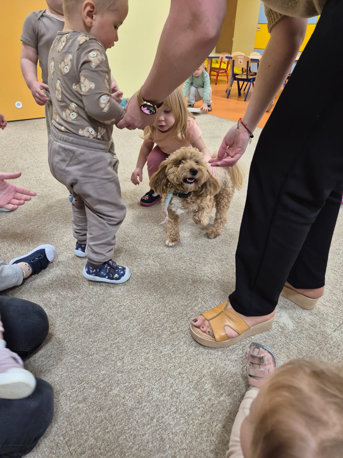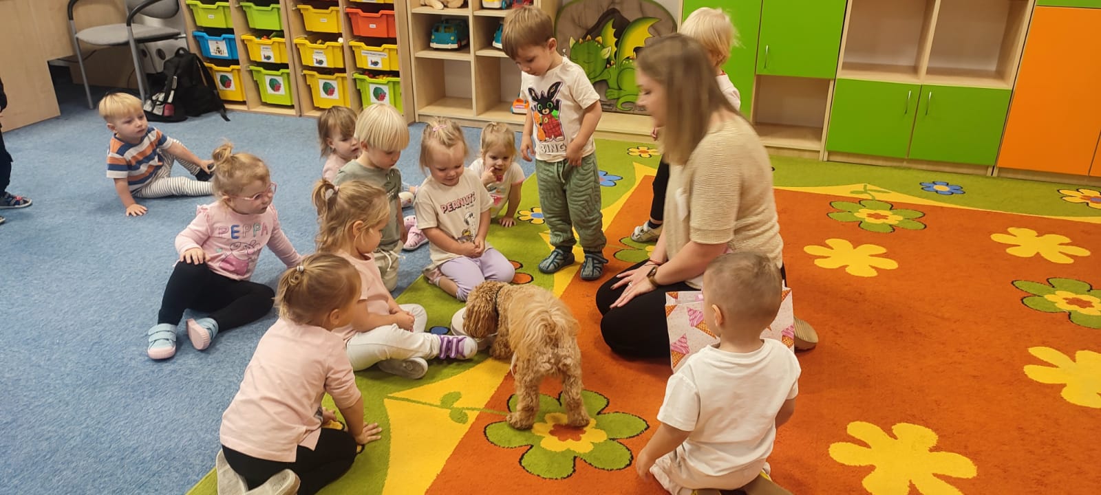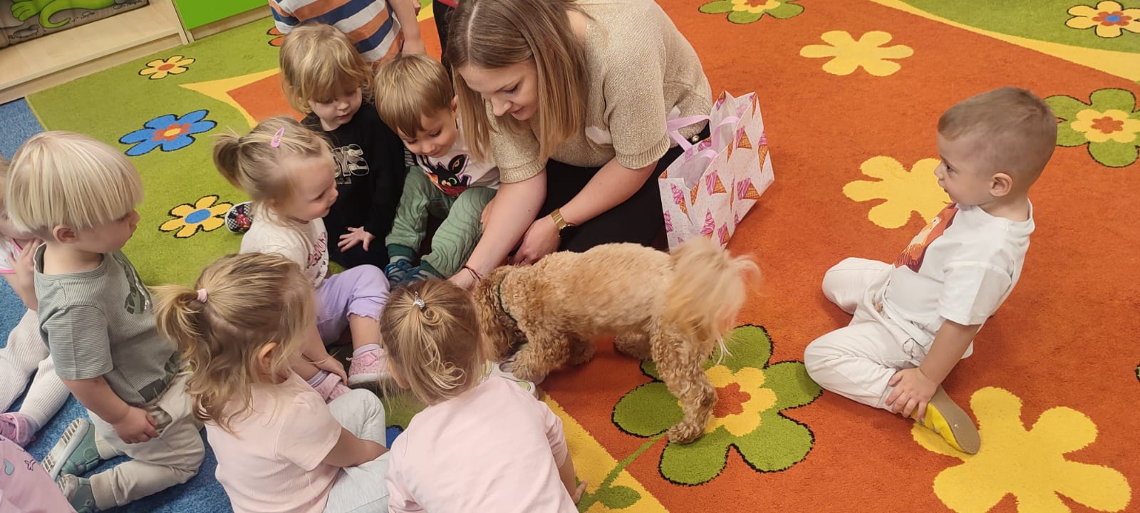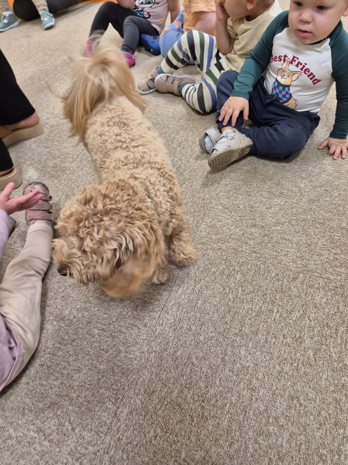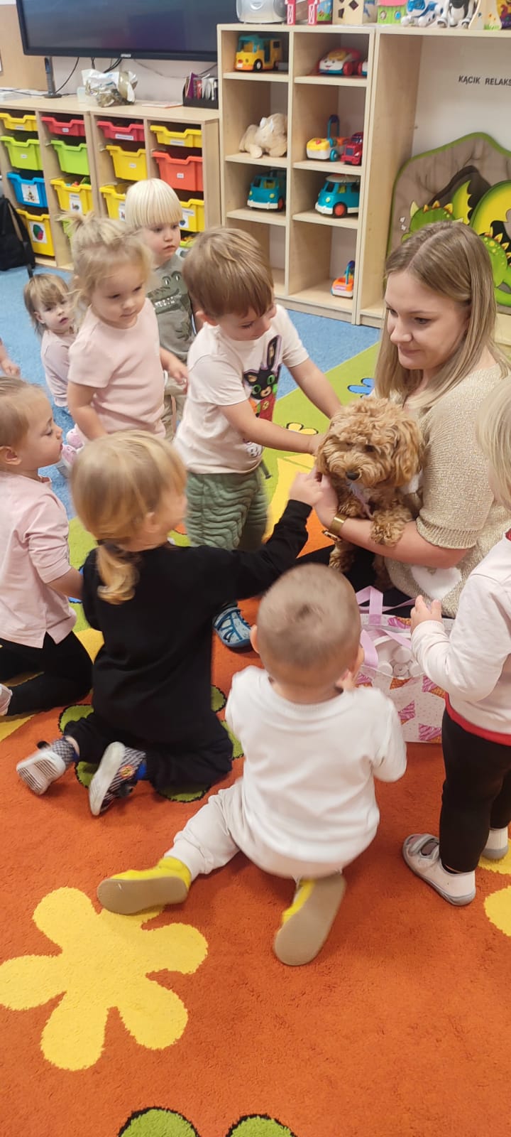 Największą atrakcją dnia był prawdziwy piesek, który odwiedził nasz żłobek! Dzieci były zachwycone jego obecnością. Piesek był bardzo grzeczny, pozwalał się głaskać i chętnie bawił się z maluchami.