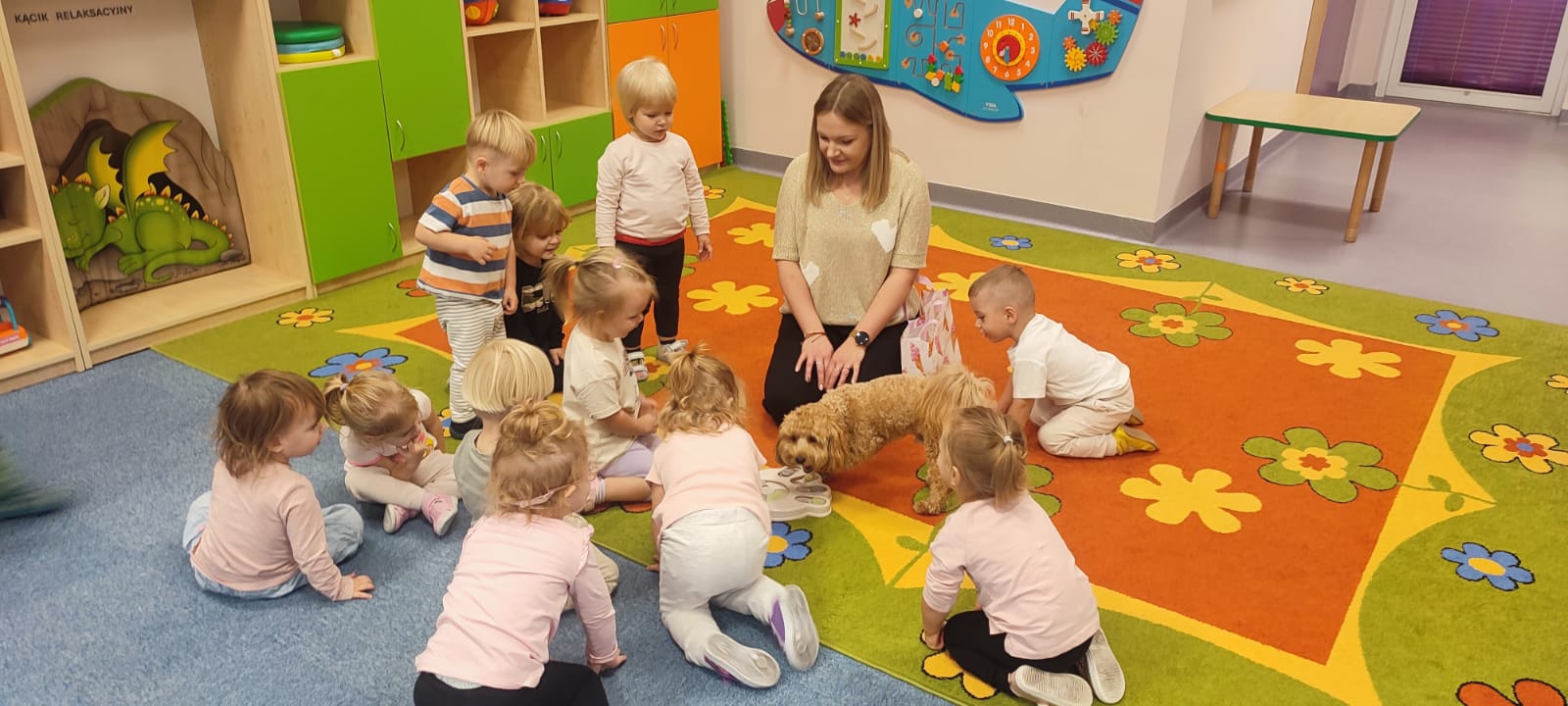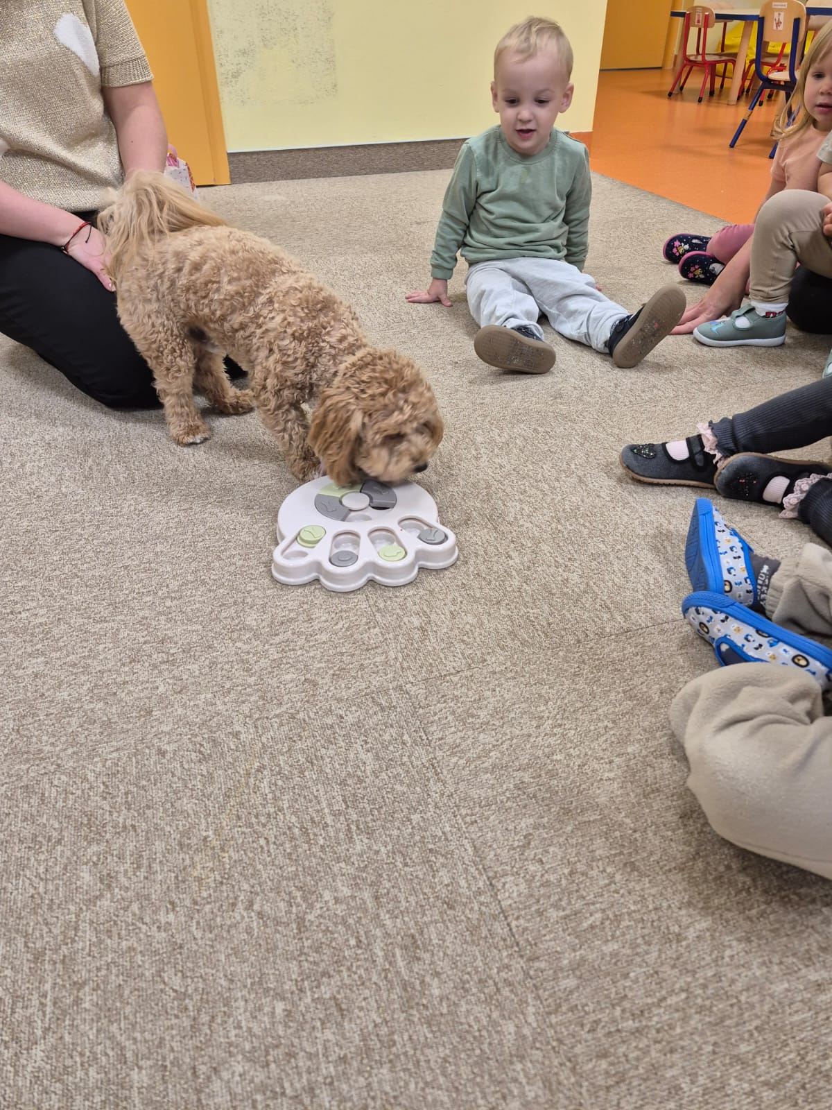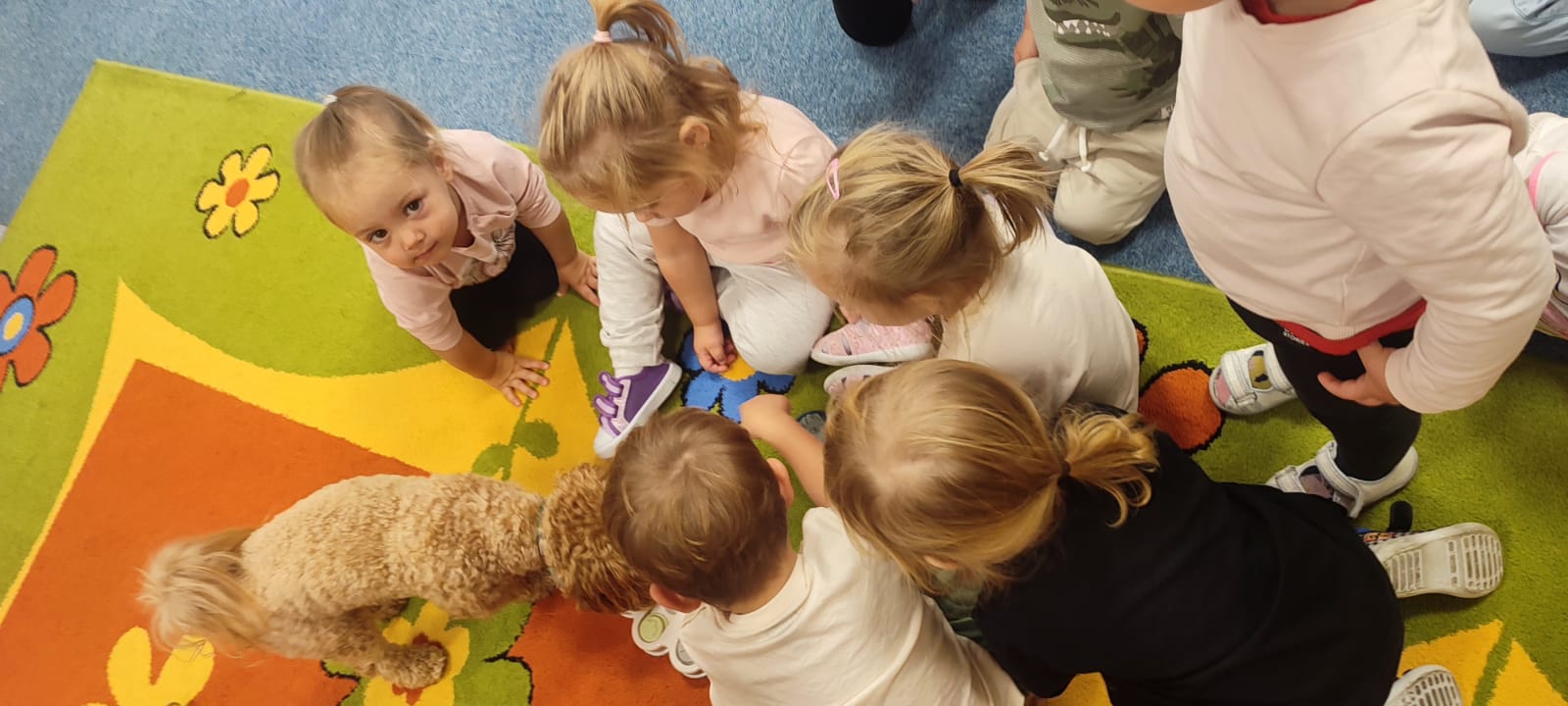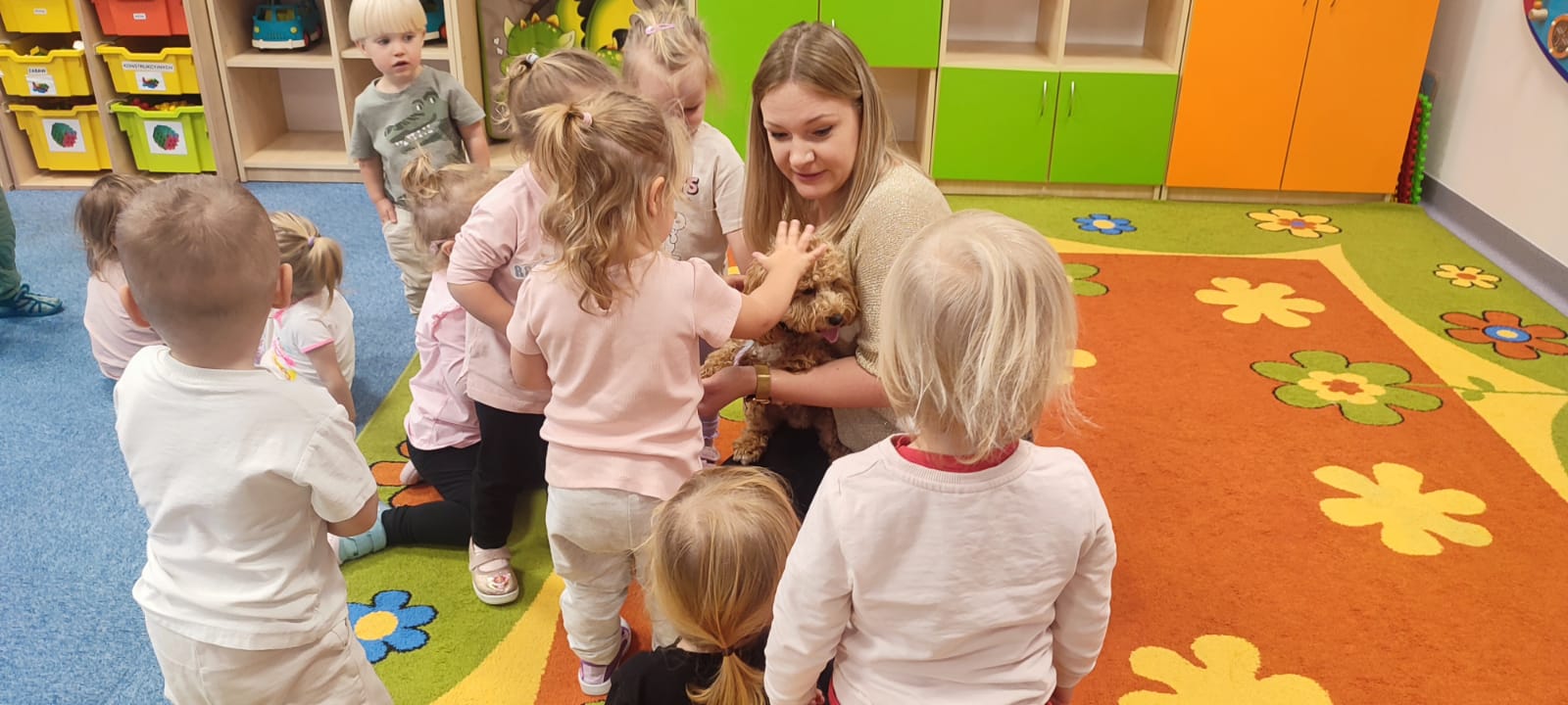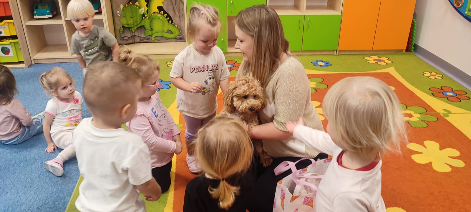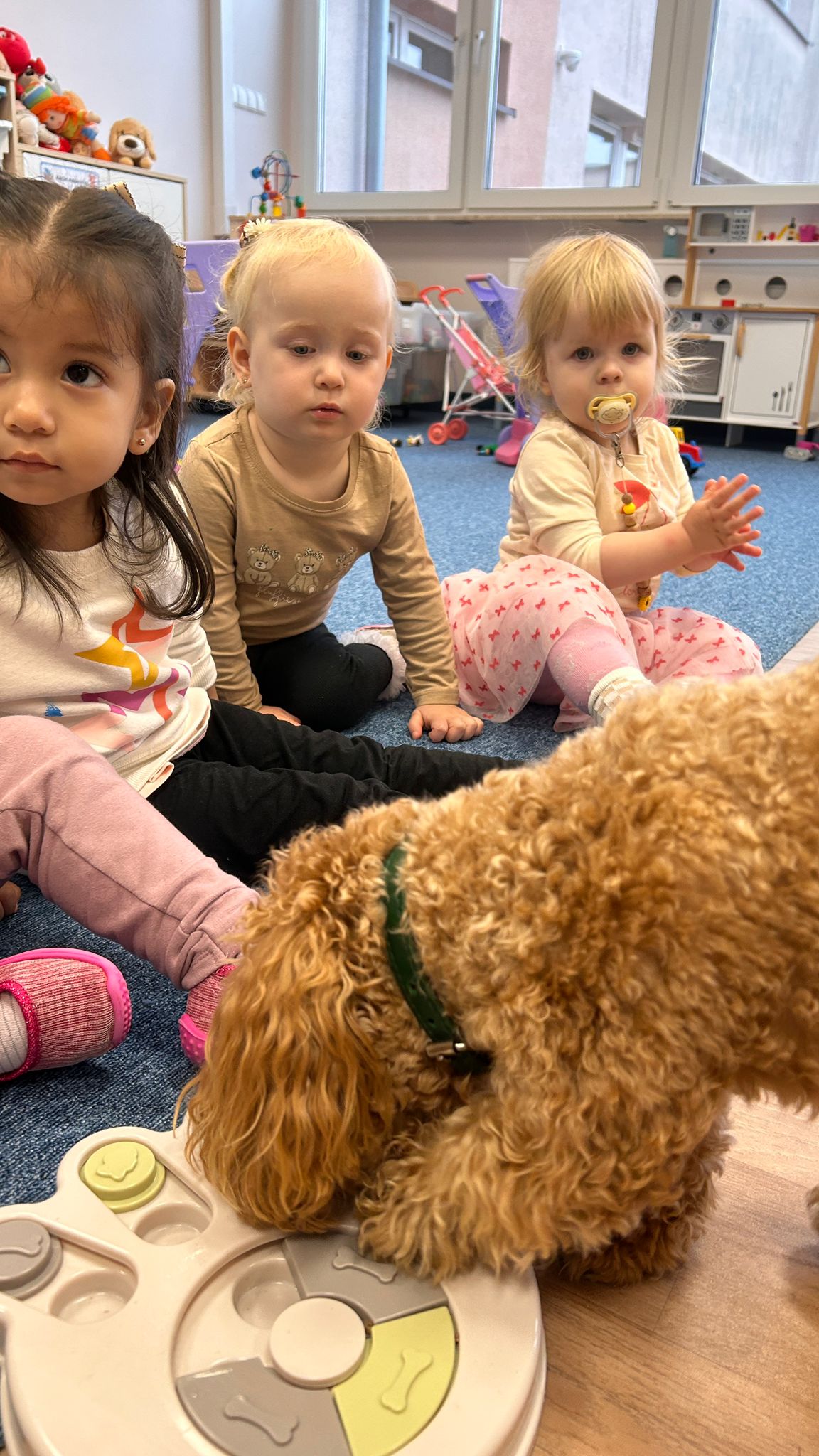 Największą atrakcją dnia był prawdziwy piesek, który odwiedził nasz żłobek! Dzieci były zachwycone jego obecnością. Piesek był bardzo grzeczny, pozwalał się głaskać i chętnie bawił się z maluchami.