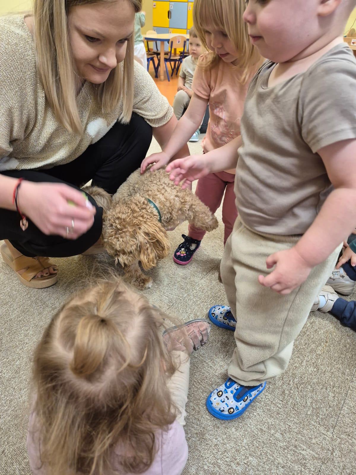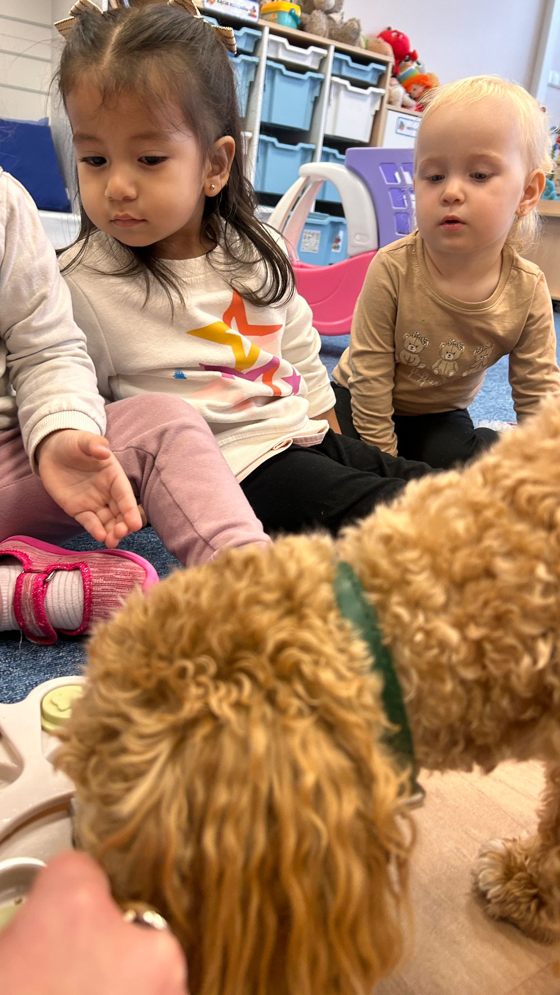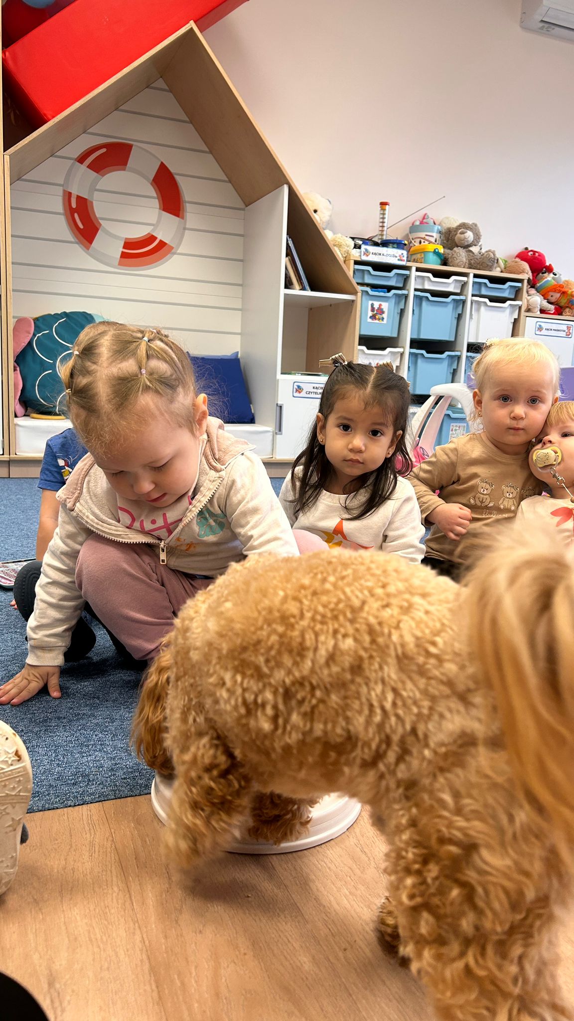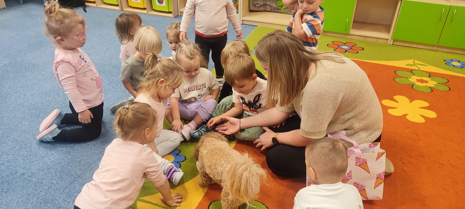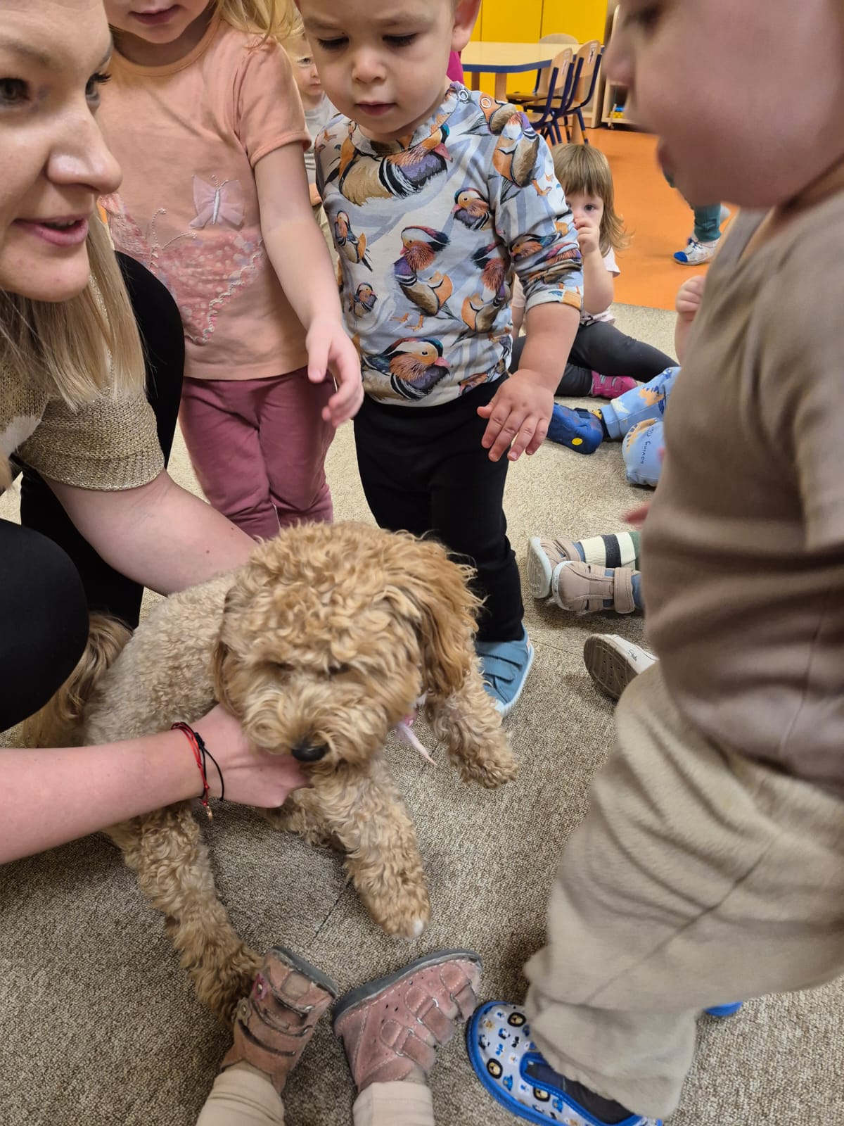 Największą atrakcją dnia był prawdziwy piesek, który odwiedził nasz żłobek! Dzieci były zachwycone jego obecnością. Piesek był bardzo grzeczny, pozwalał się głaskać i chętnie bawił się z maluchami.