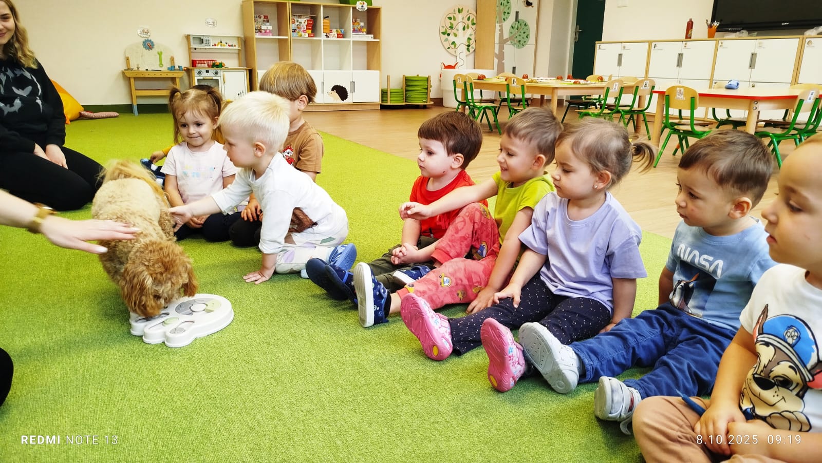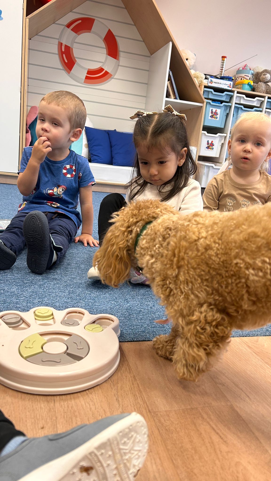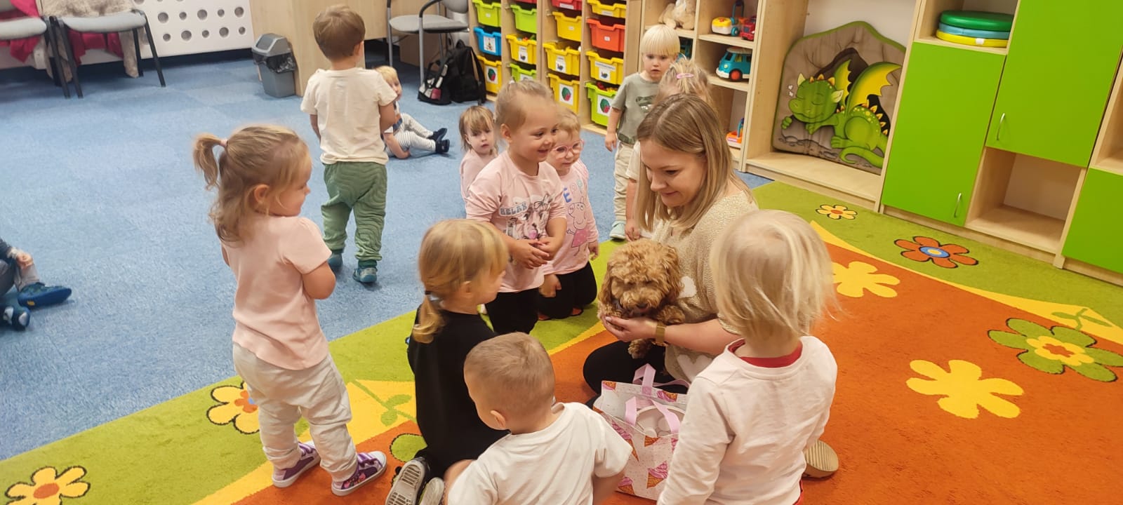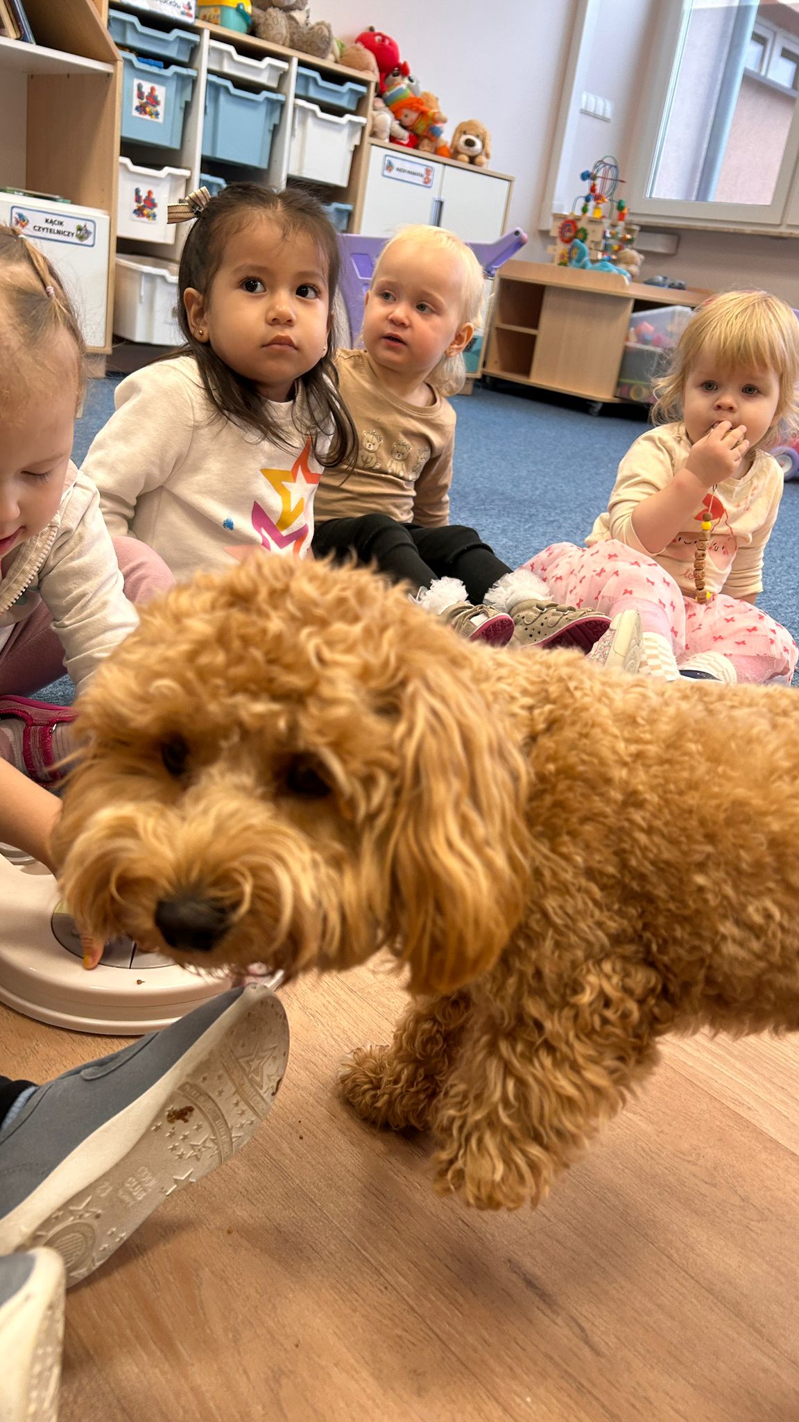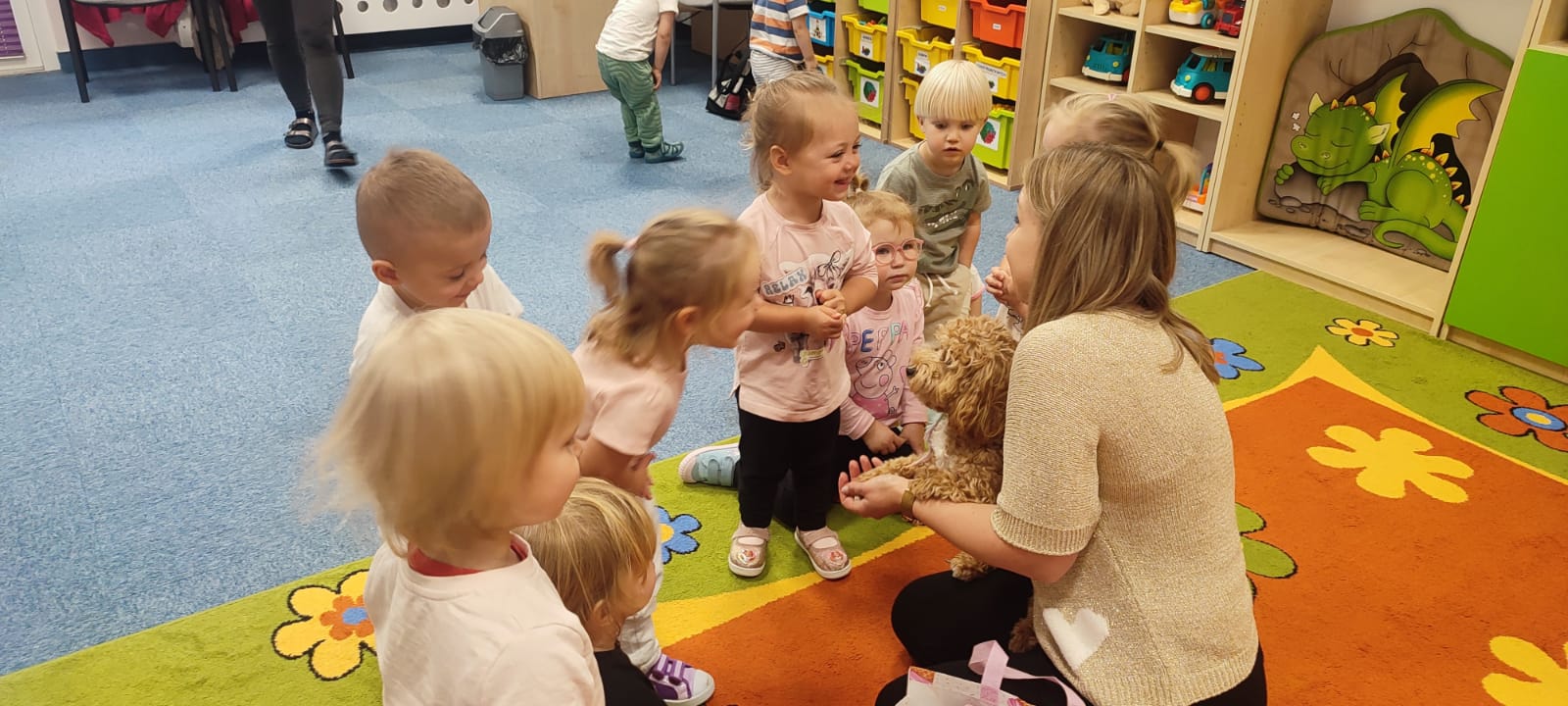 Największą atrakcją dnia był prawdziwy piesek, który odwiedził nasz żłobek! Dzieci były zachwycone jego obecnością. Piesek był bardzo grzeczny, pozwalał się głaskać i chętnie bawił się z maluchami.