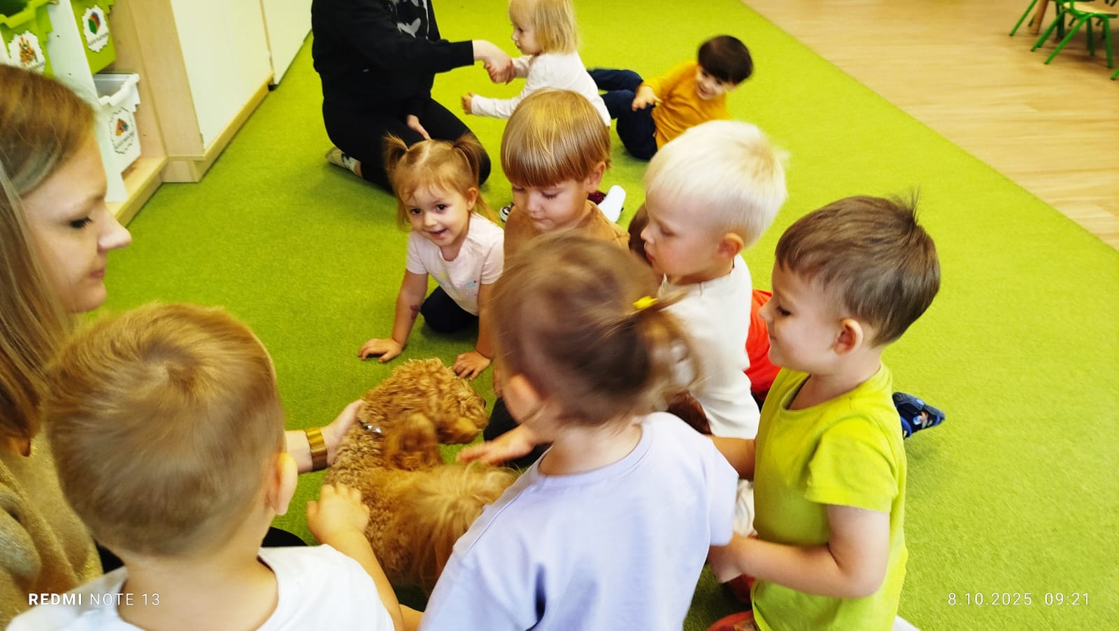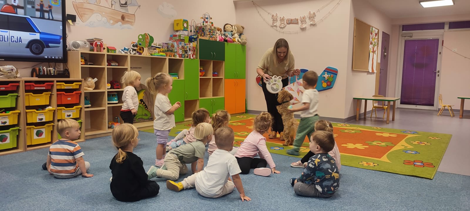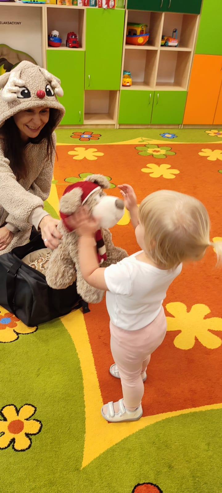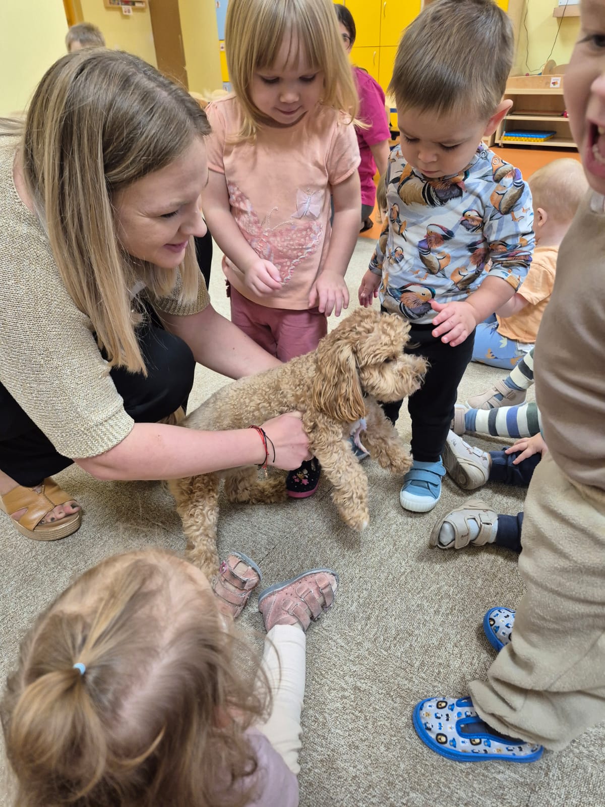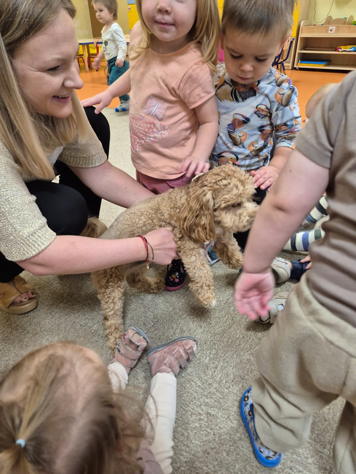 Największą atrakcją dnia był prawdziwy piesek, który odwiedził nasz żłobek! Dzieci były zachwycone jego obecnością. Piesek był bardzo grzeczny, pozwalał się głaskać i chętnie bawił się z maluchami.