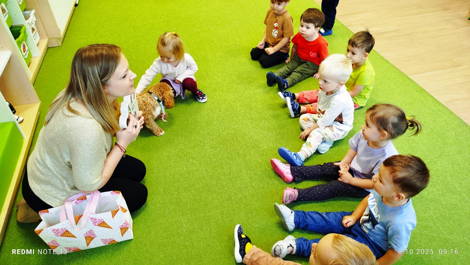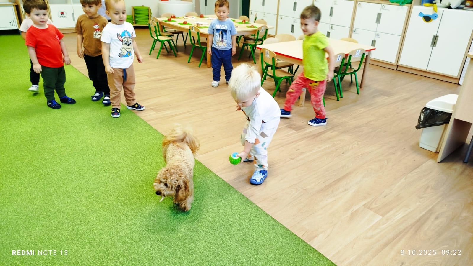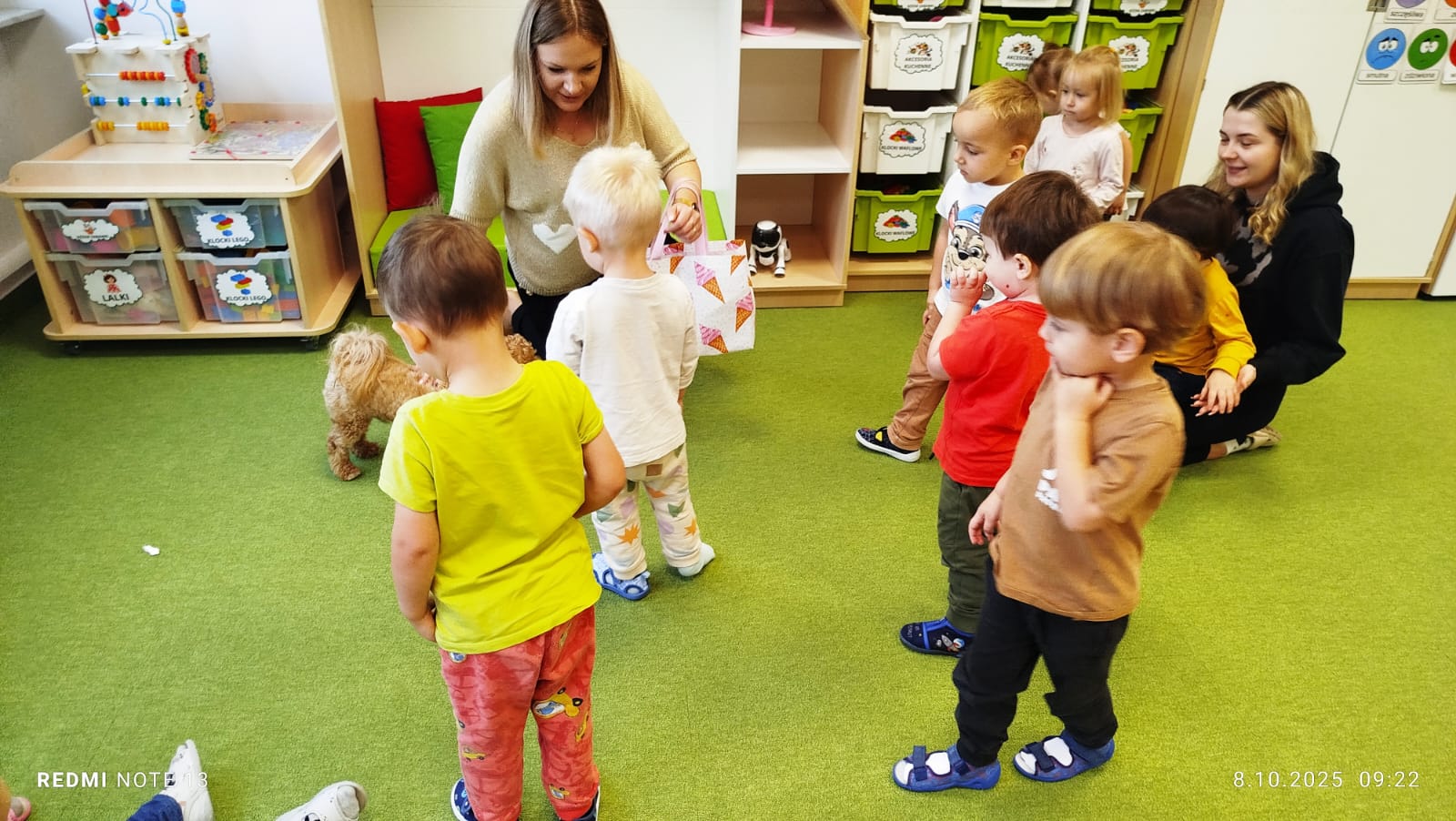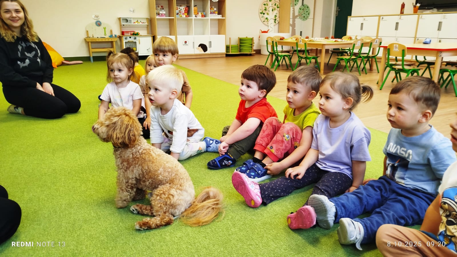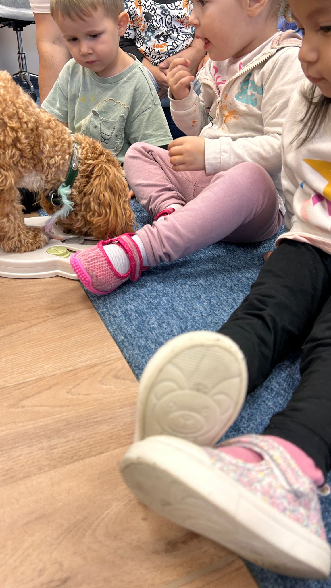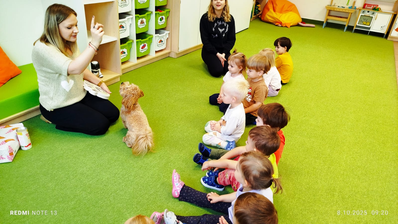 Największą atrakcją dnia był prawdziwy piesek, który odwiedził nasz żłobek! Dzieci były zachwycone jego obecnością. Piesek był bardzo grzeczny, pozwalał się głaskać i chętnie bawił się z maluchami.
