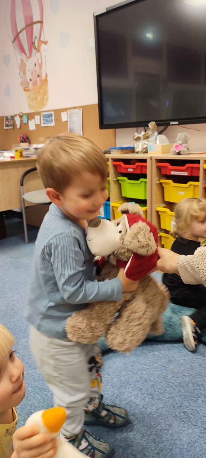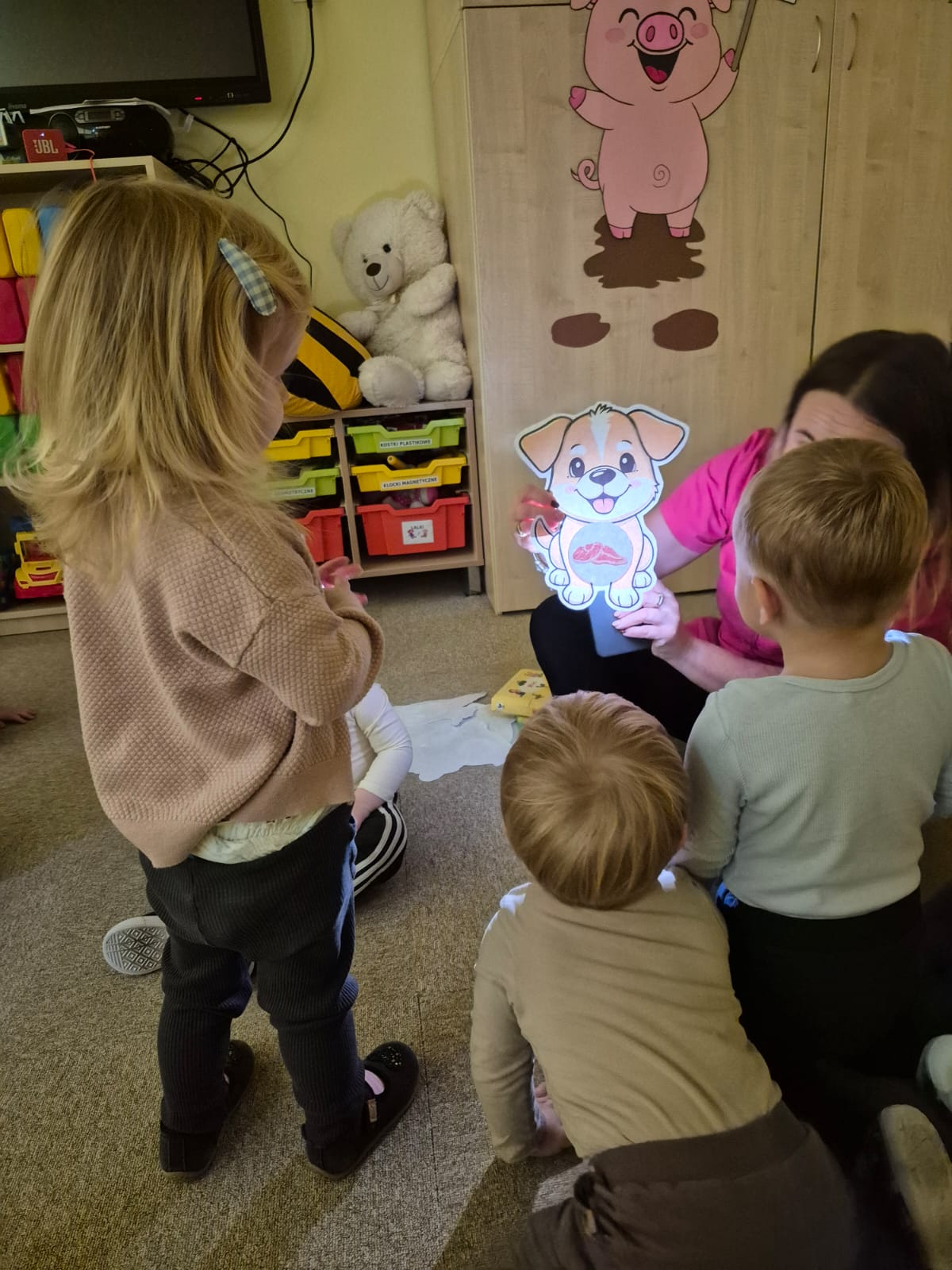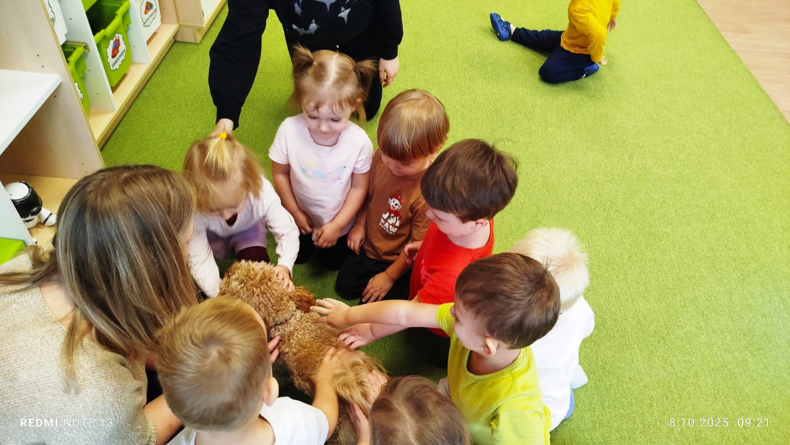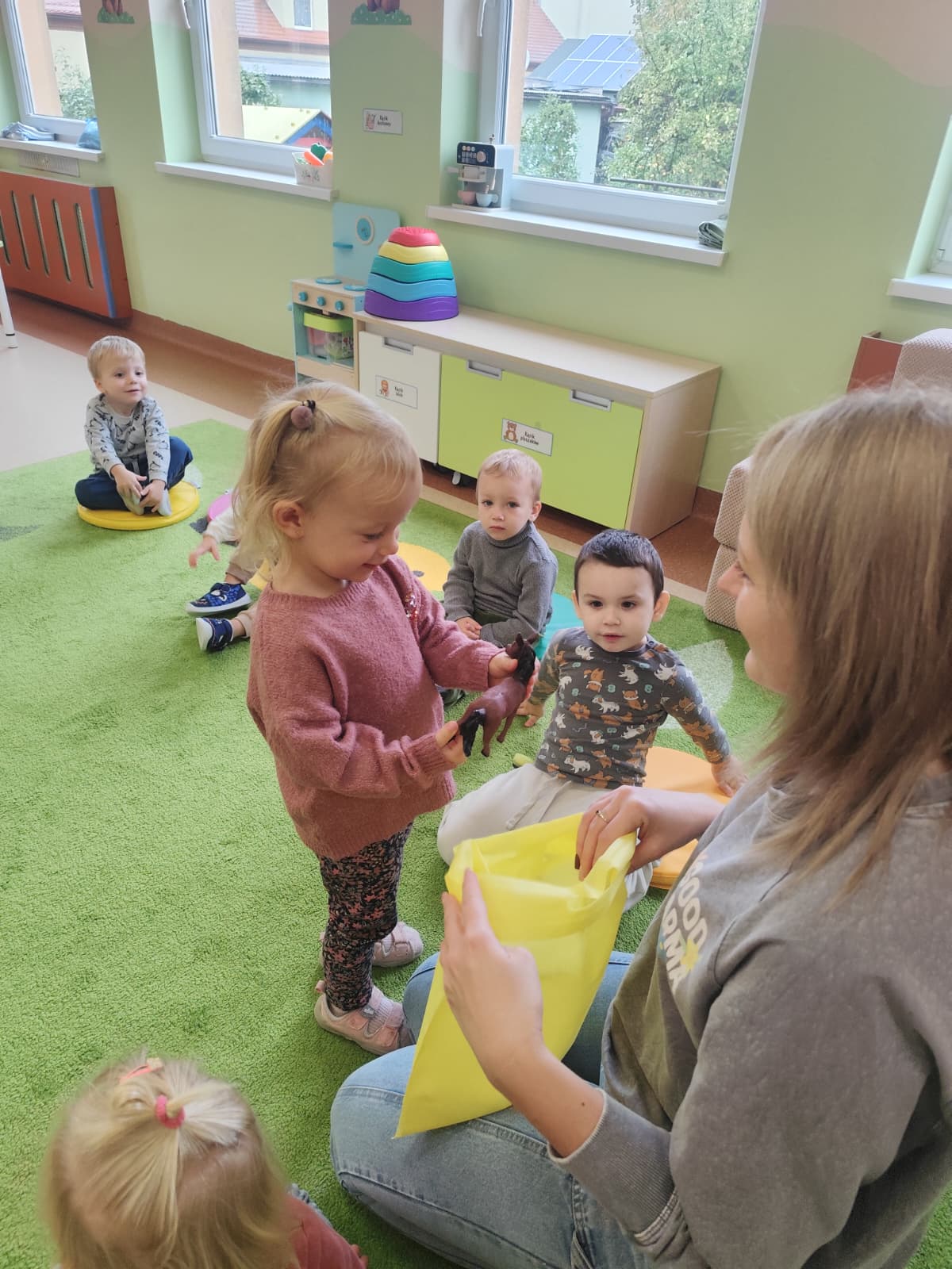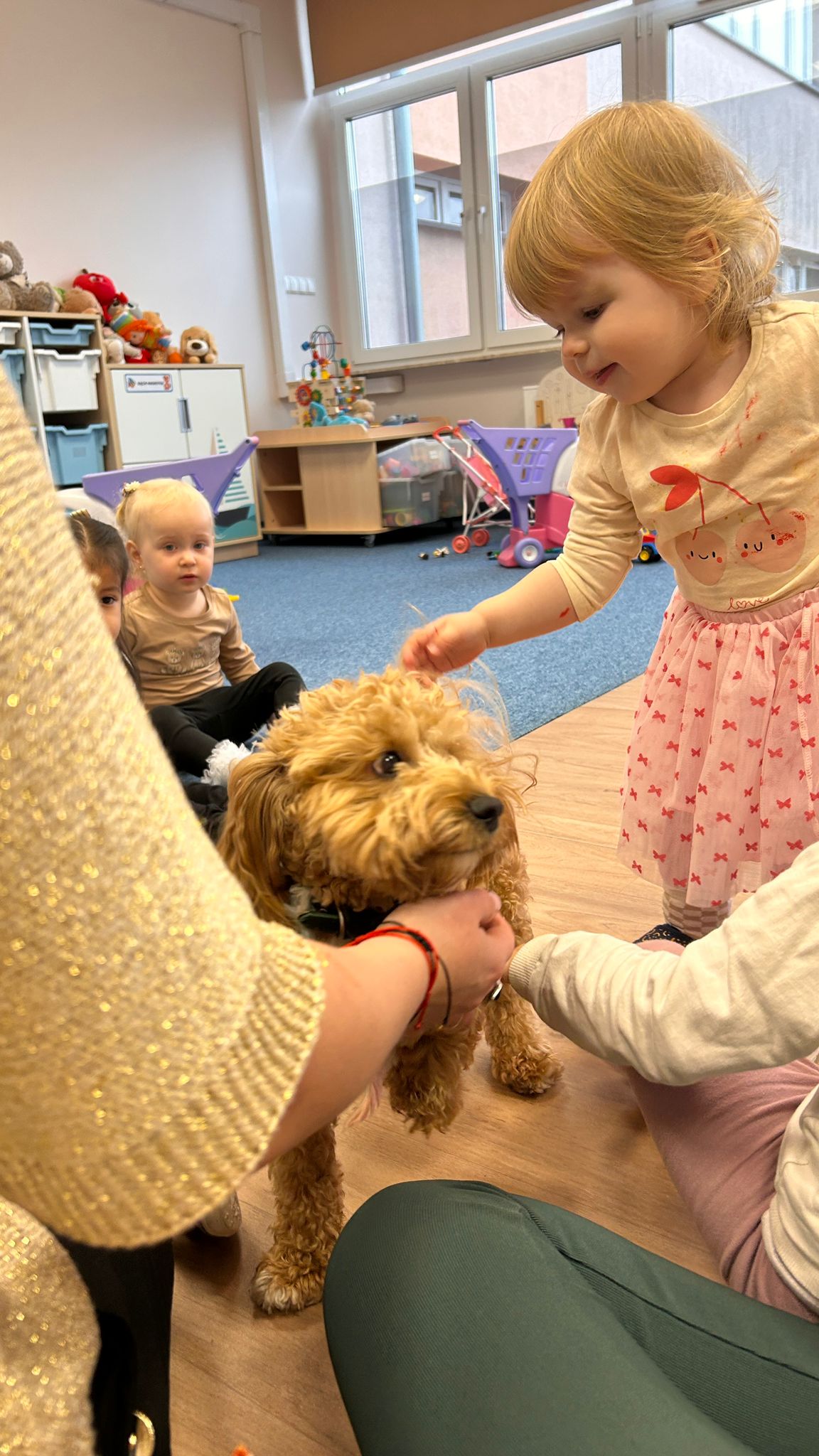 Największą atrakcją dnia był prawdziwy piesek, który odwiedził nasz żłobek! Dzieci były zachwycone jego obecnością. Piesek był bardzo grzeczny, pozwalał się głaskać i chętnie bawił się z maluchami.