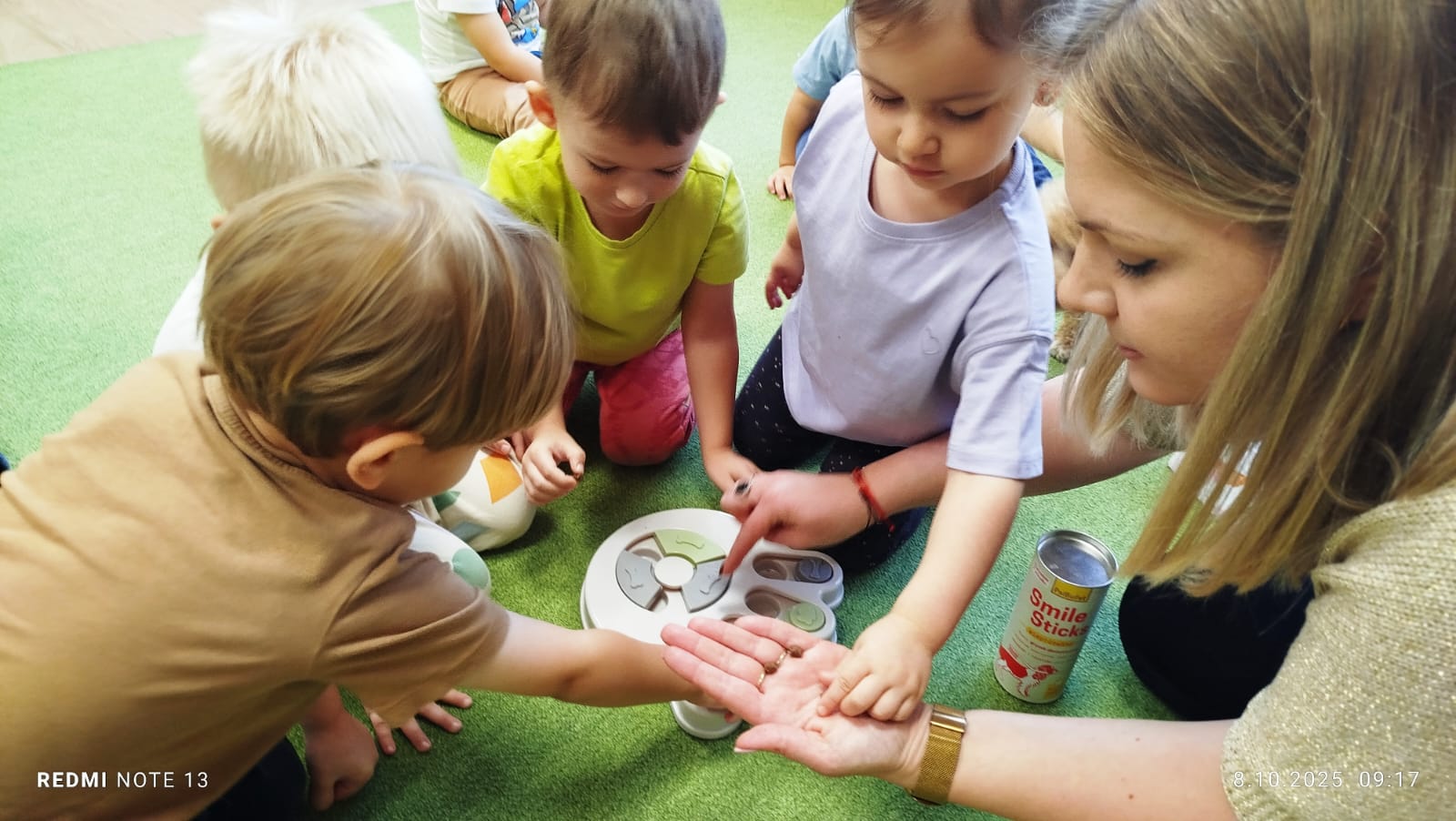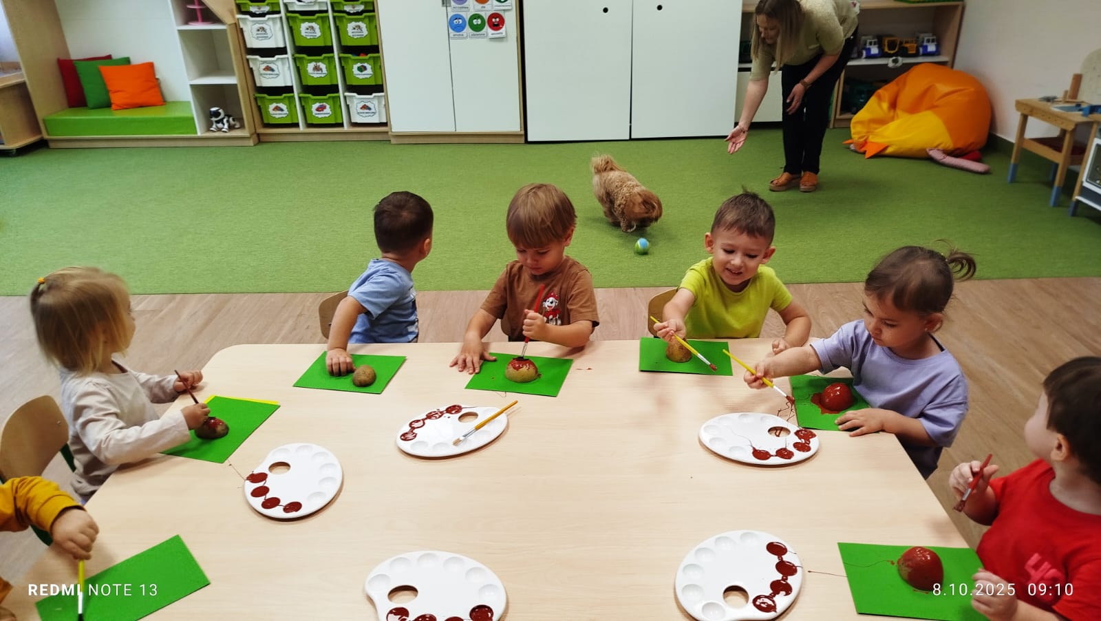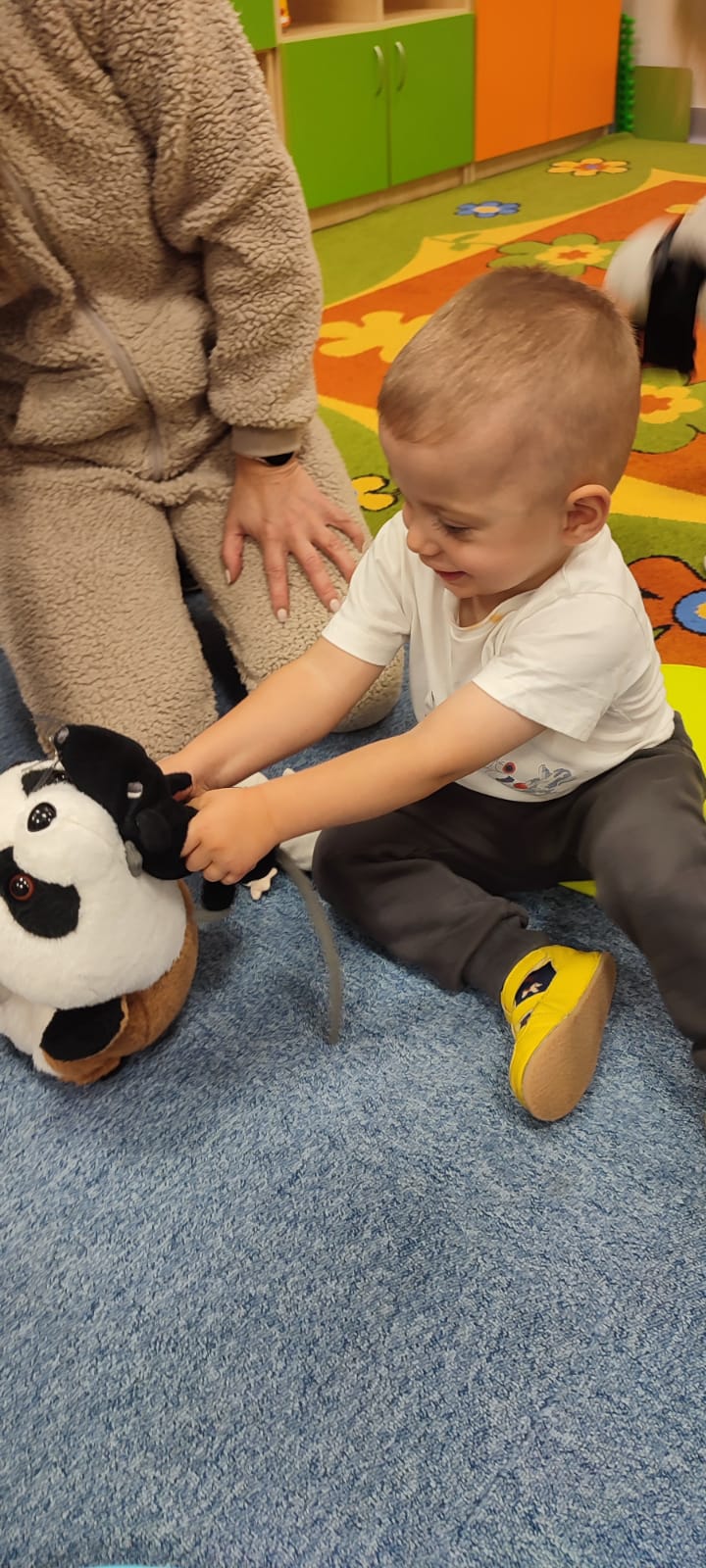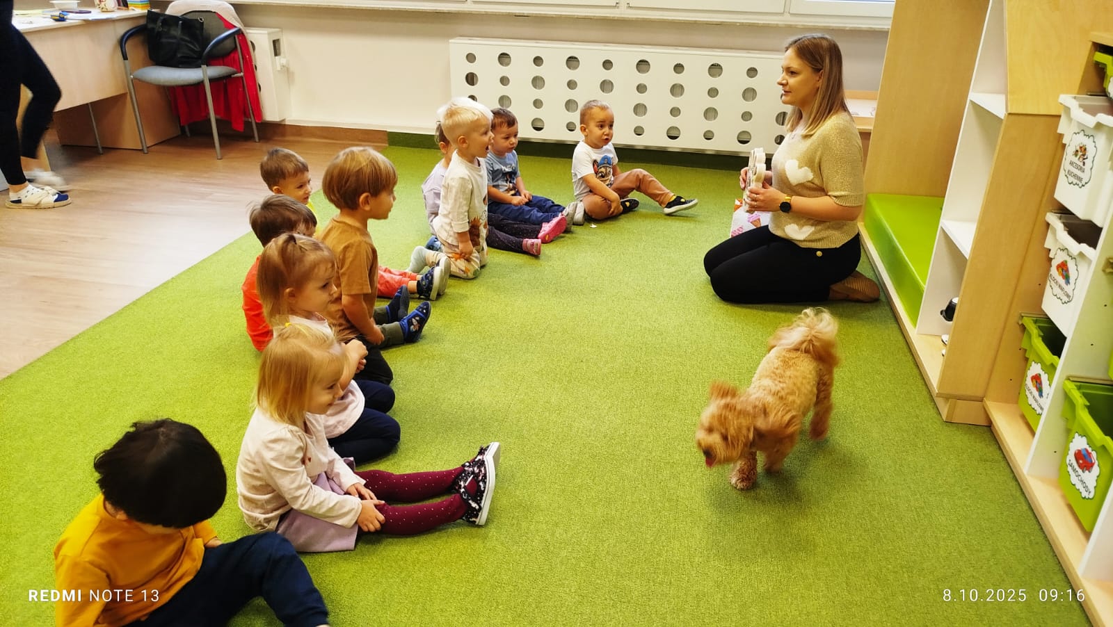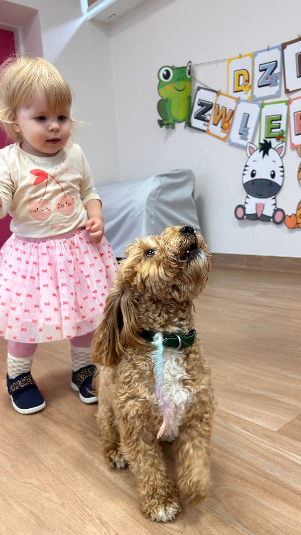 Największą atrakcją dnia był prawdziwy piesek, który odwiedził nasz żłobek! Dzieci były zachwycone jego obecnością. Piesek był bardzo grzeczny, pozwalał się głaskać i chętnie bawił się z maluchami.