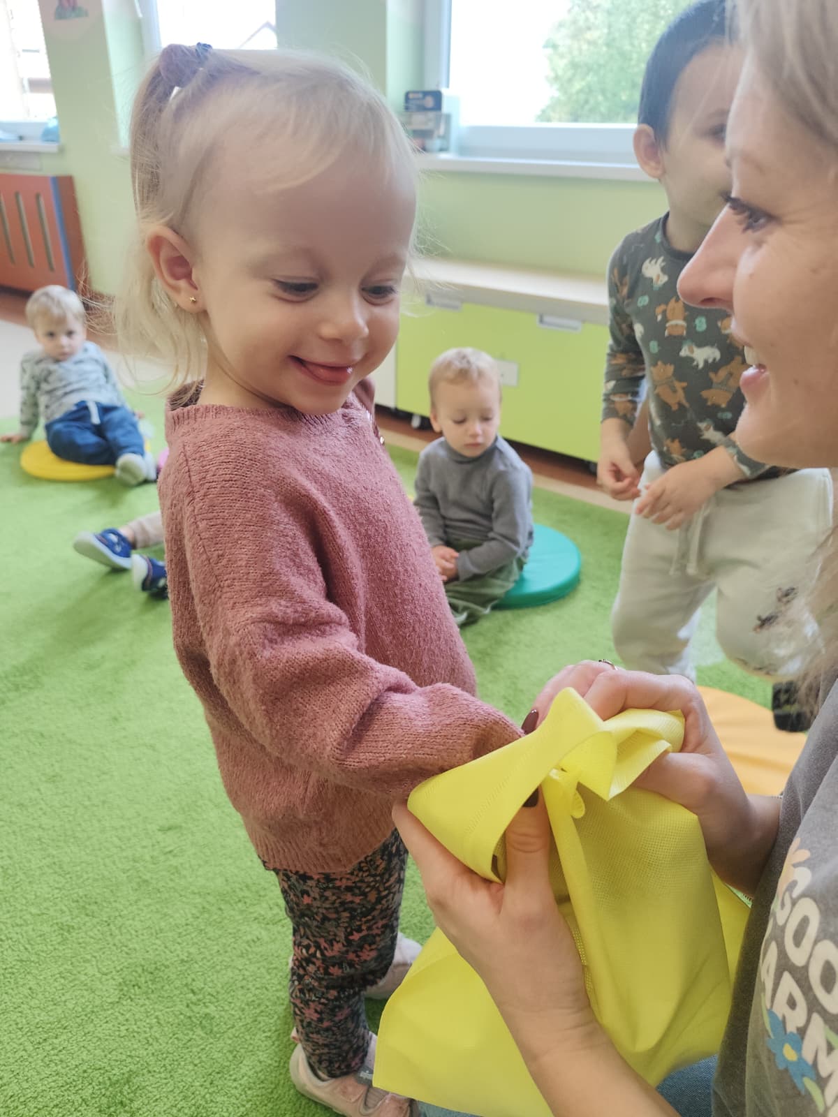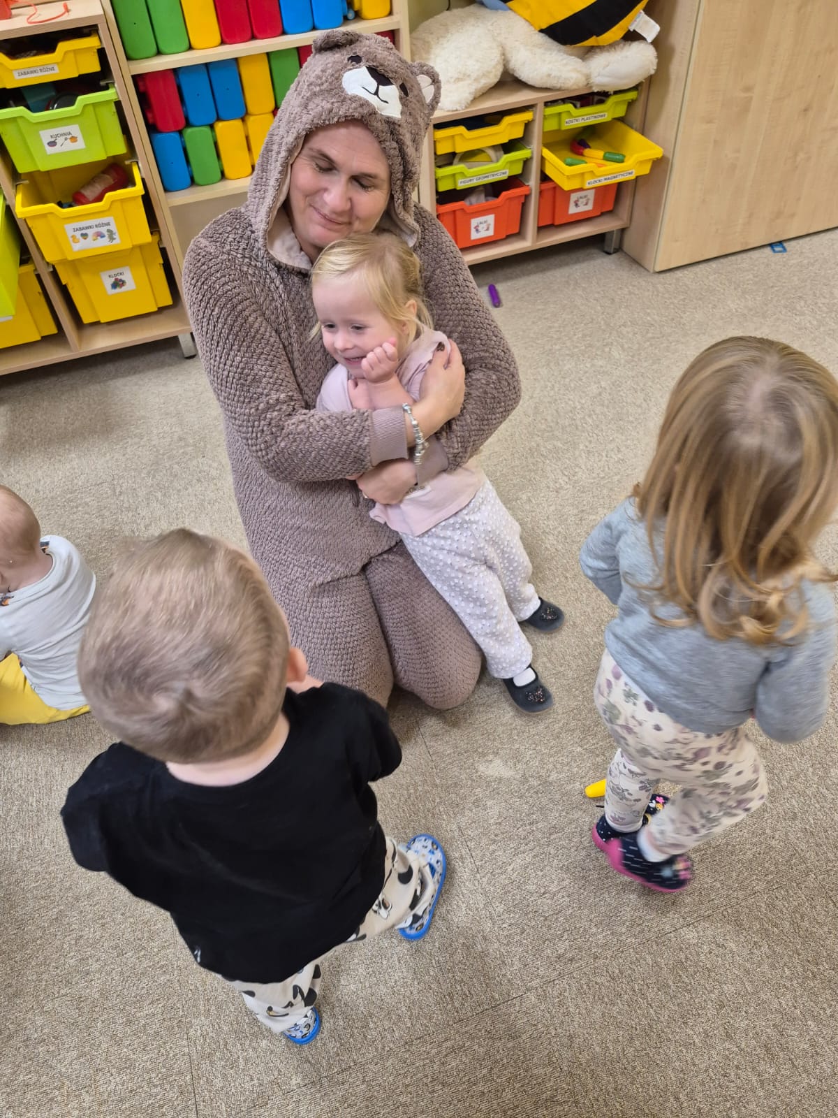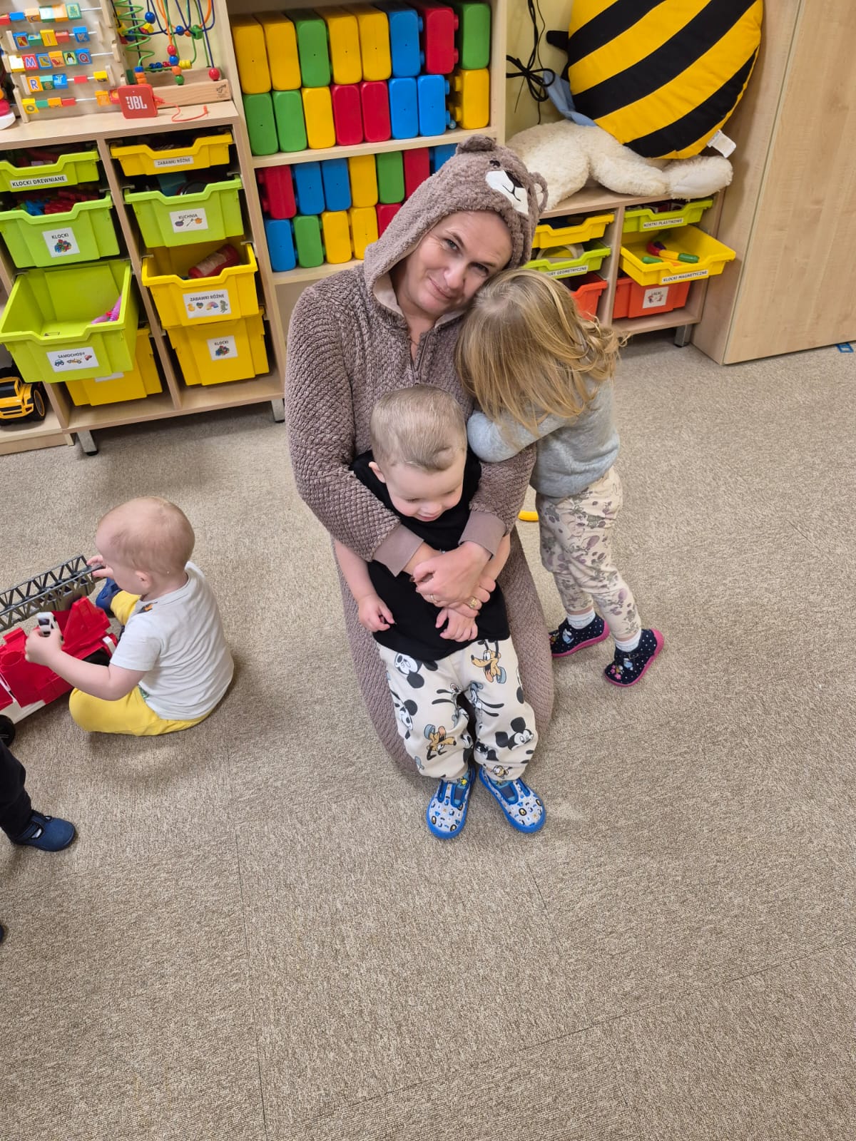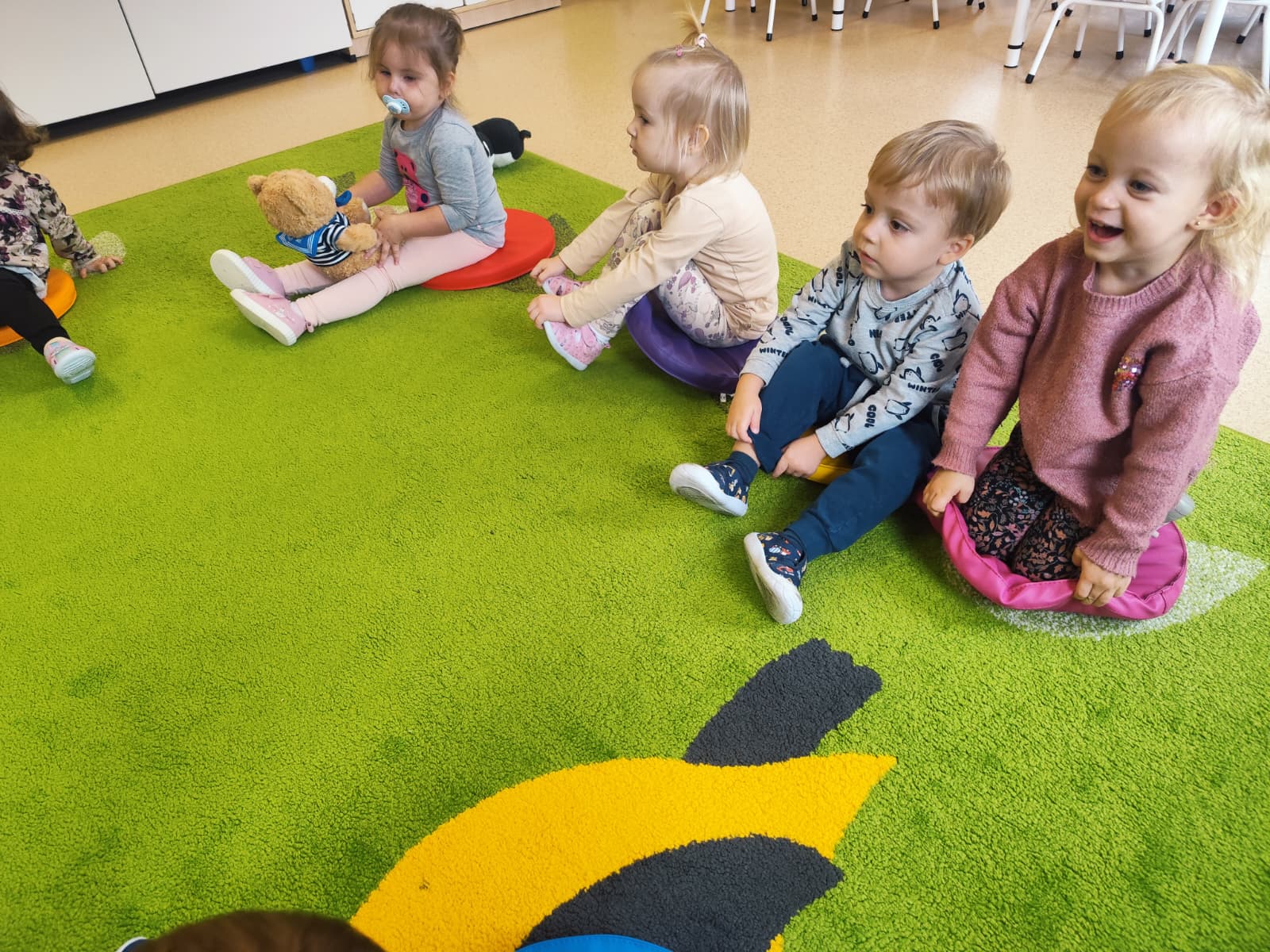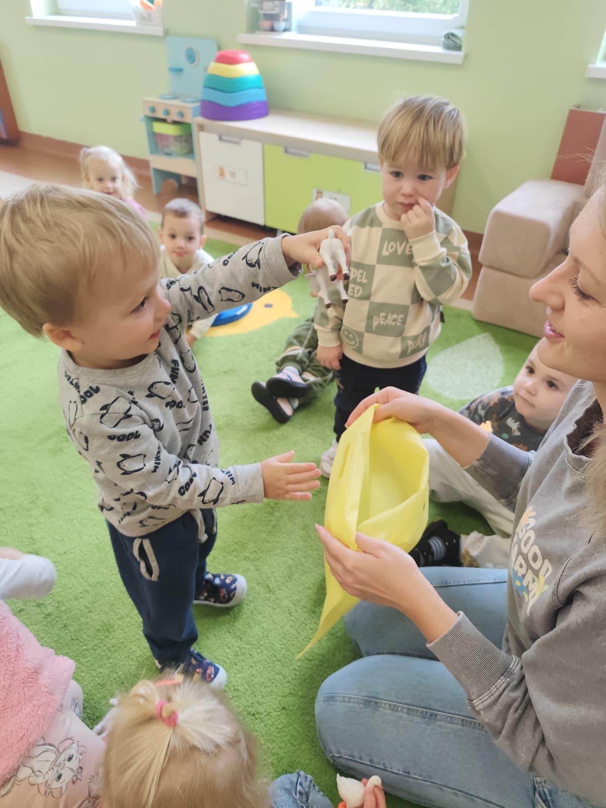 Największą atrakcją dnia był prawdziwy piesek, który odwiedził nasz żłobek! Dzieci były zachwycone jego obecnością. Piesek był bardzo grzeczny, pozwalał się głaskać i chętnie bawił się z maluchami.