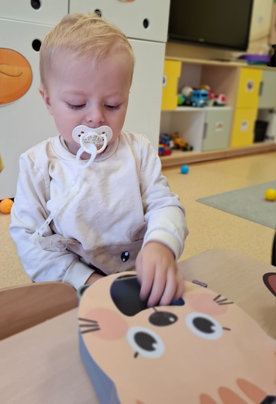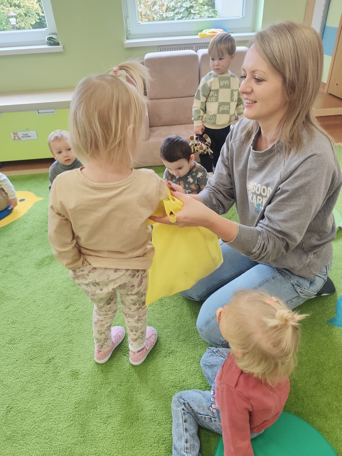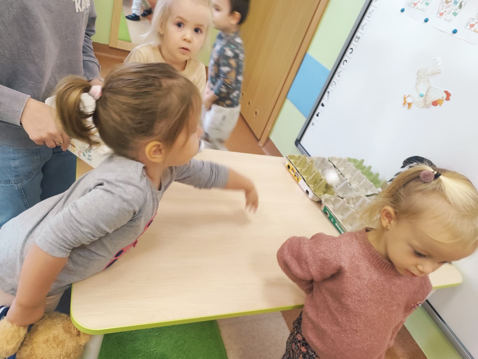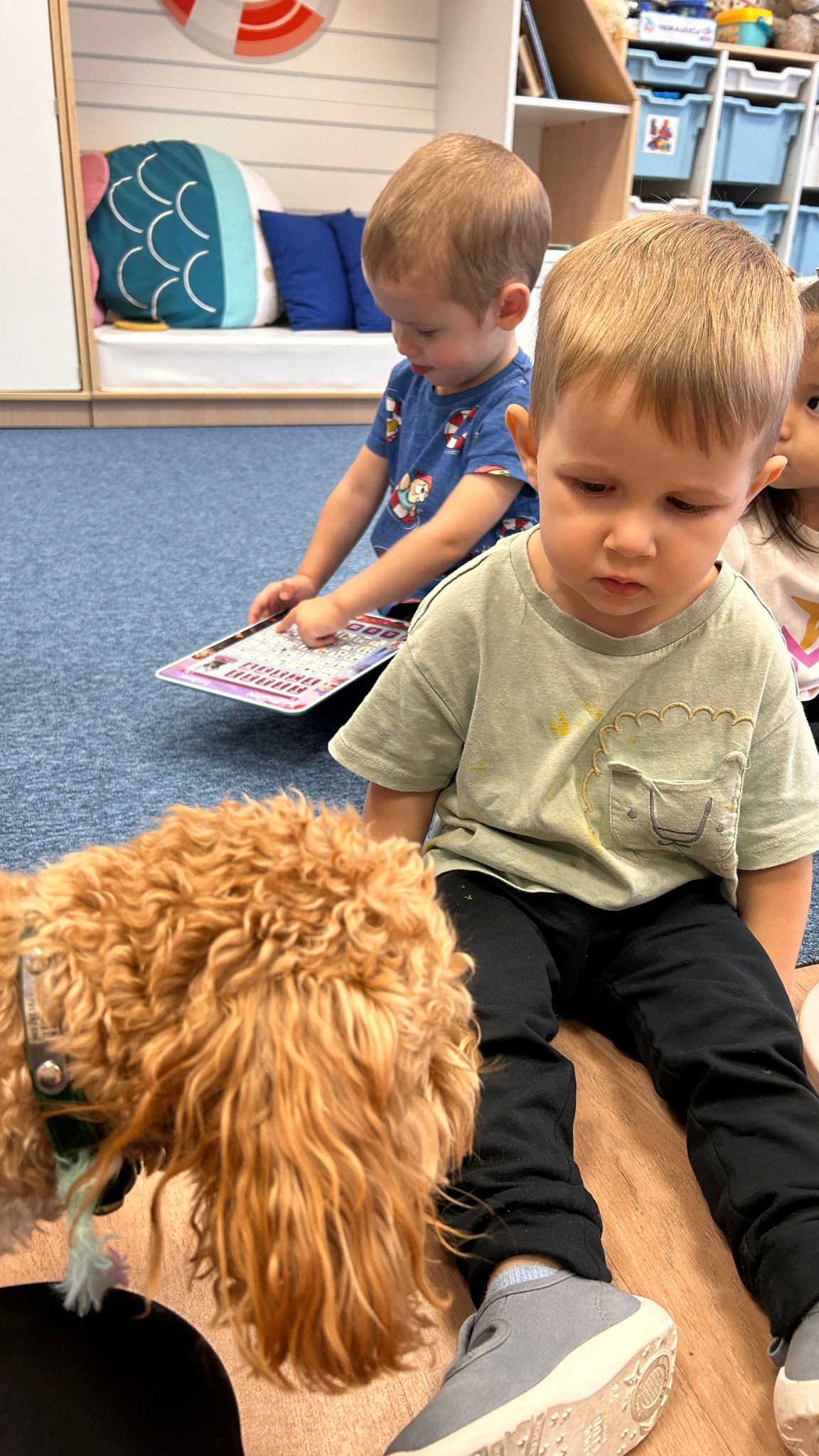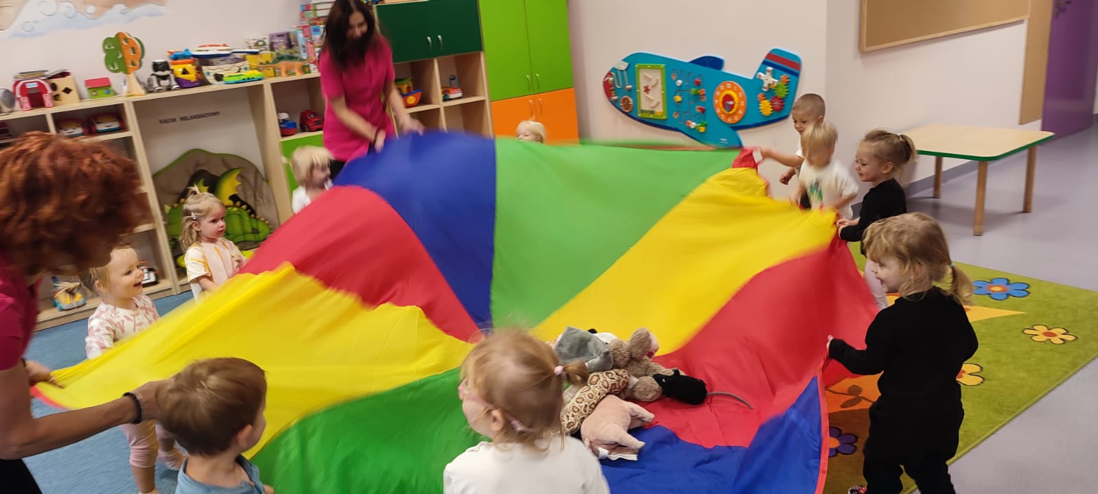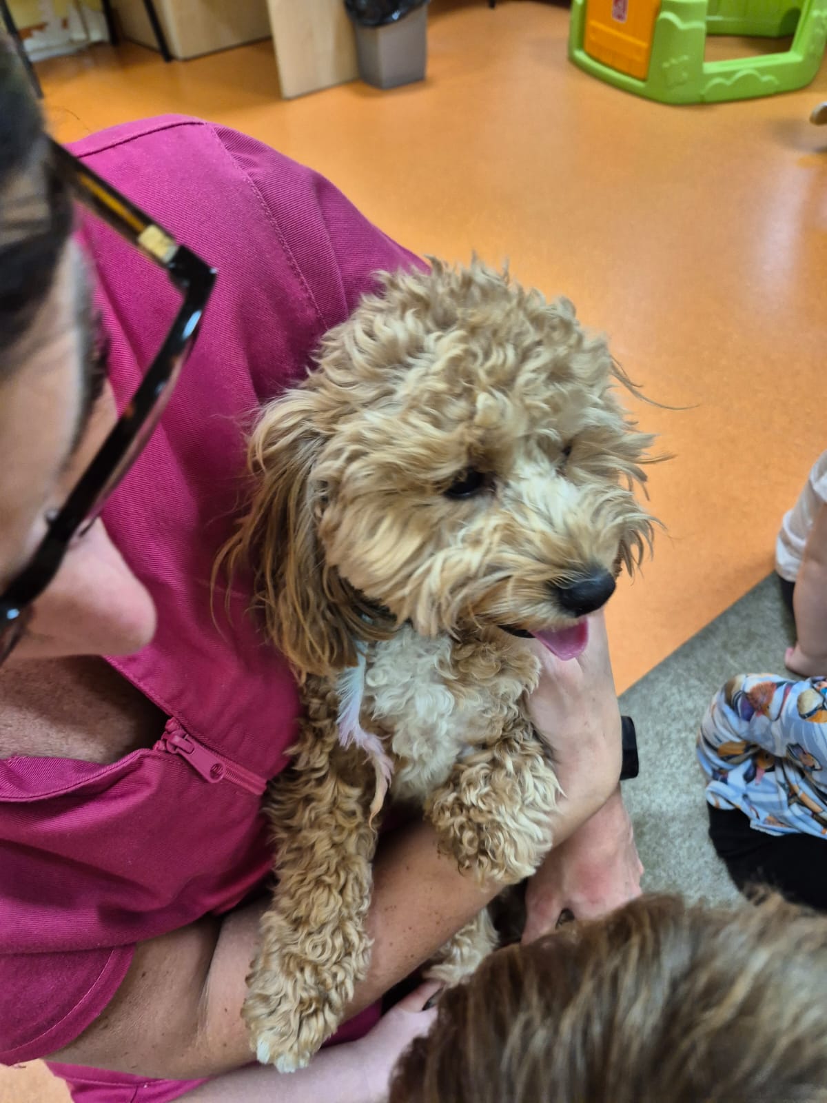 Największą atrakcją dnia był prawdziwy piesek, który odwiedził nasz żłobek! Dzieci były zachwycone jego obecnością. Piesek był bardzo grzeczny, pozwalał się głaskać i chętnie bawił się z maluchami.