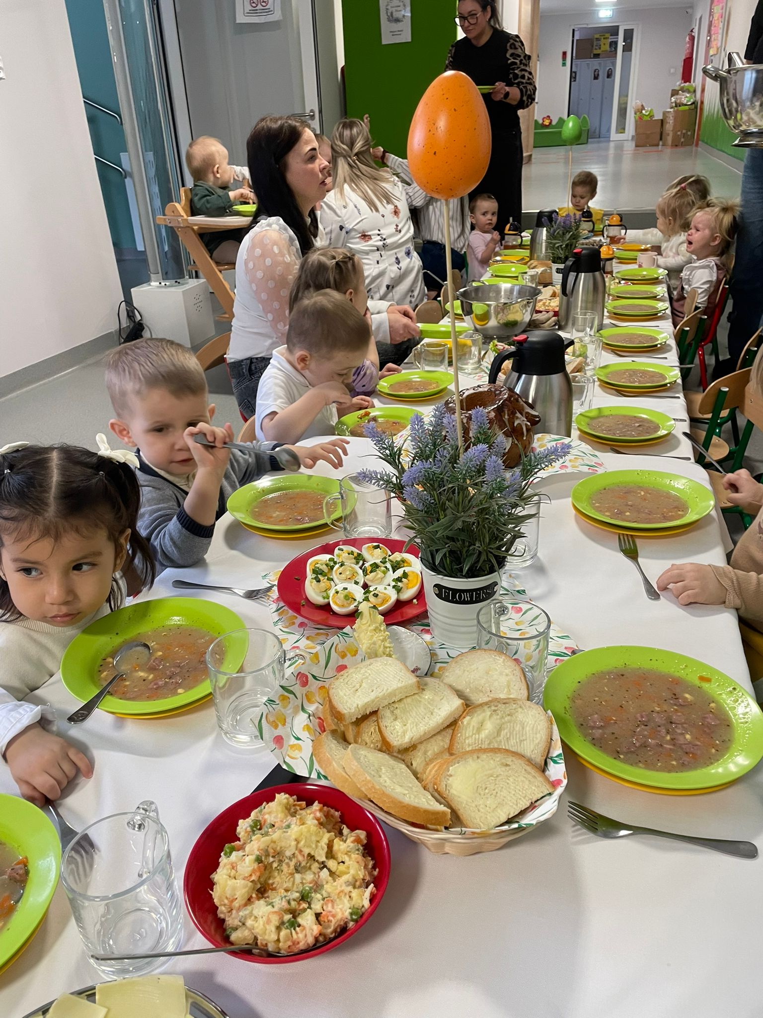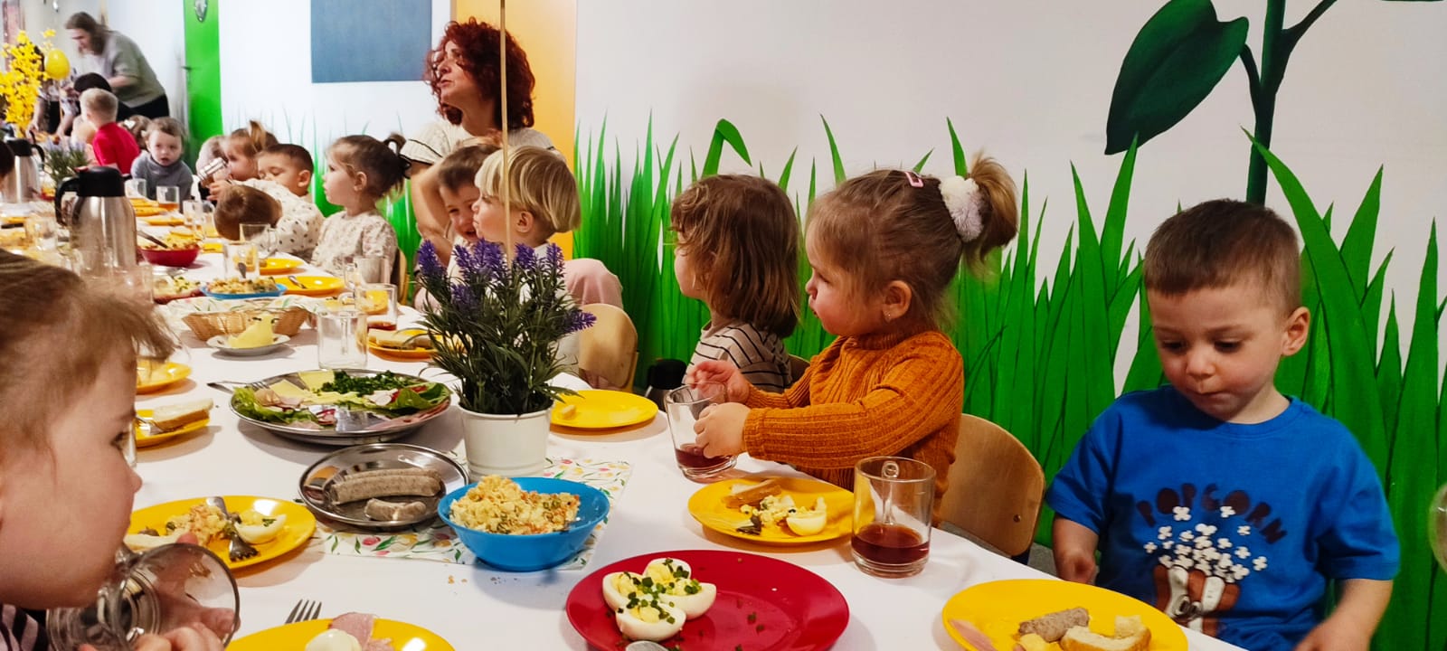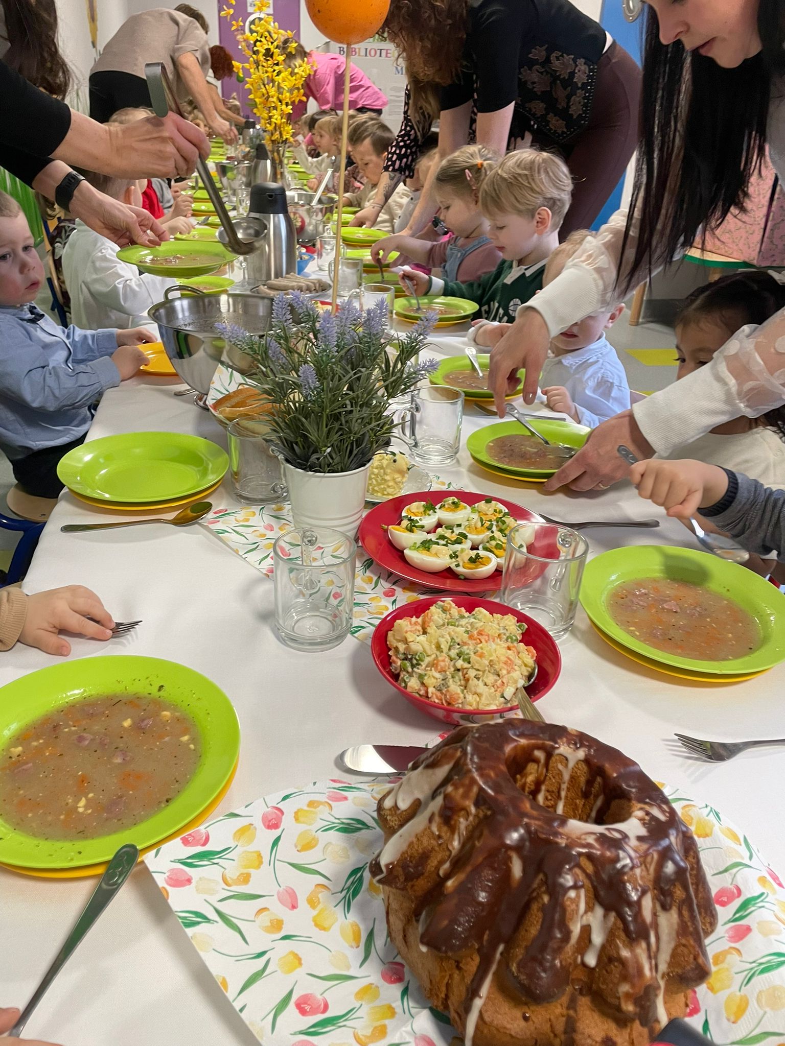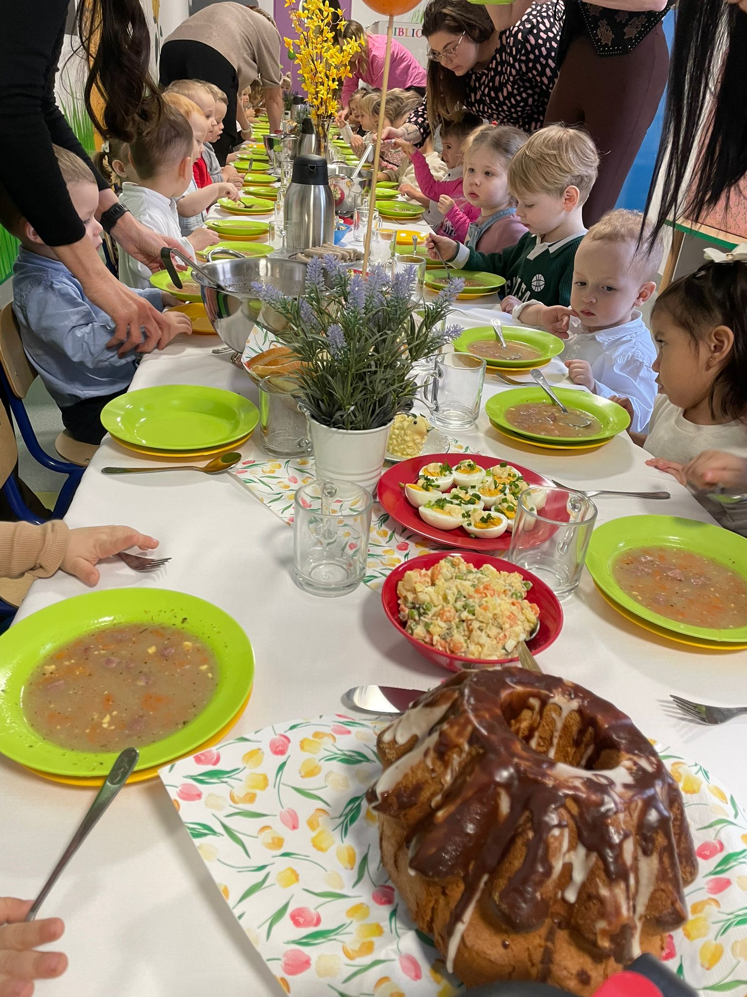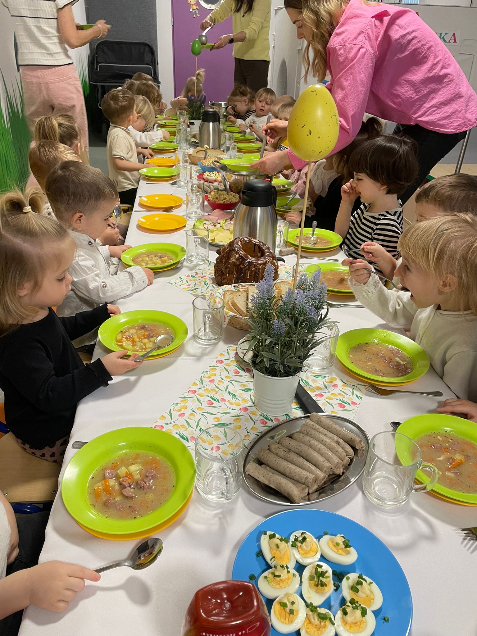 W dniach poprzedzających Święta Wielkanocne w naszym żłobku panowała wyjątkowa, radosna atmosfera, pełna tradycji i wspólnego świętowania. 31 marca odbyło się uroczyste śniadanko oraz obiad wielkanocny. Na stołach pojawiły się tradycyjne potrawy – od aromatycznego żurku po słodką, wielkanocną babkę. Dzieci miały okazję spróbować świątecznych smaków, a także wspólnie spędzić czas przy pięknie udekorowanych stołach, ucząc się przy tym wielkanocnych zwyczajów.