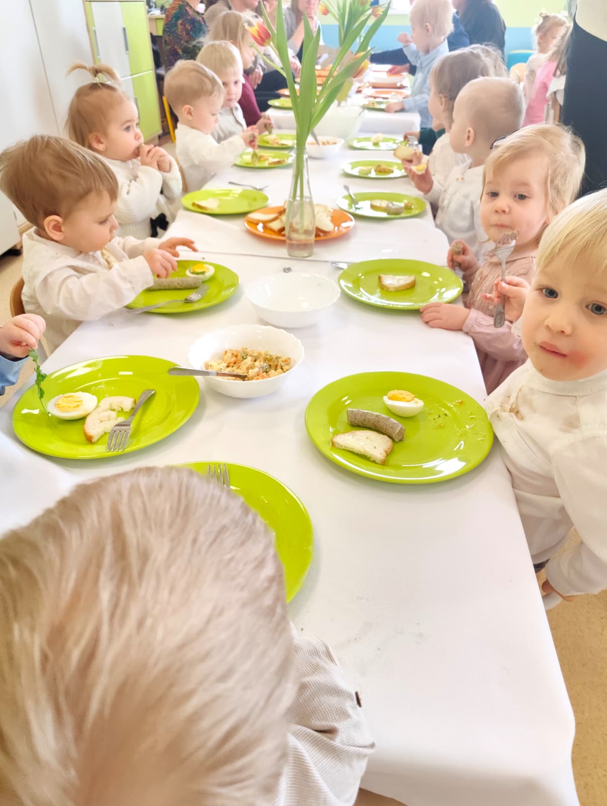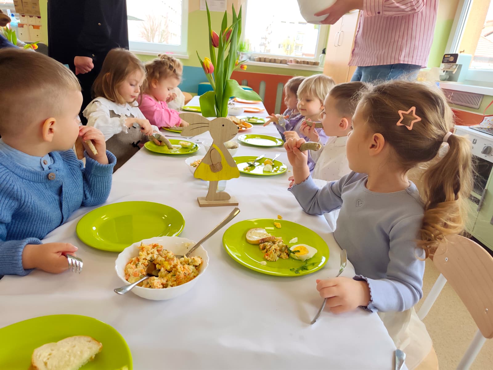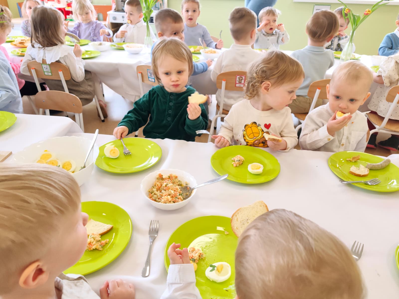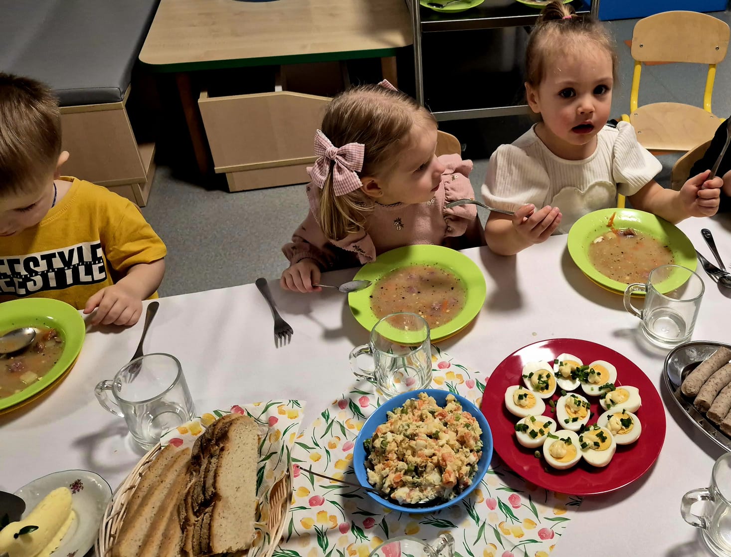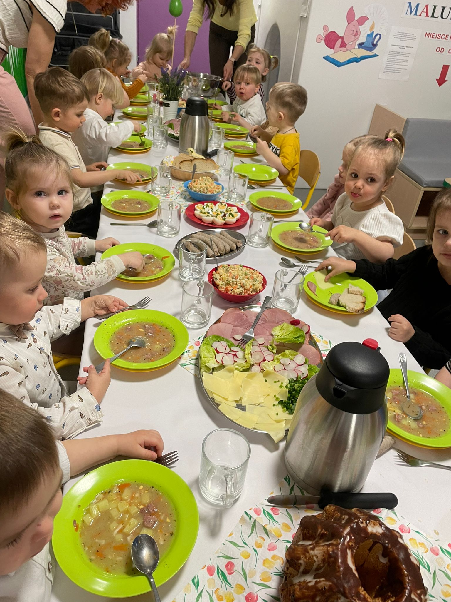 W dniach poprzedzających Święta Wielkanocne w naszym żłobku panowała wyjątkowa, radosna atmosfera, pełna tradycji i wspólnego świętowania. 31 marca odbyło się uroczyste śniadanko oraz obiad wielkanocny. Na stołach pojawiły się tradycyjne potrawy – od aromatycznego żurku po słodką, wielkanocną babkę. Dzieci miały okazję spróbować świątecznych smaków, a także wspólnie spędzić czas przy pięknie udekorowanych stołach, ucząc się przy tym wielkanocnych zwyczajów.