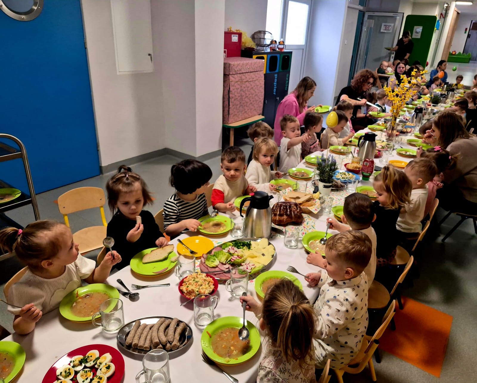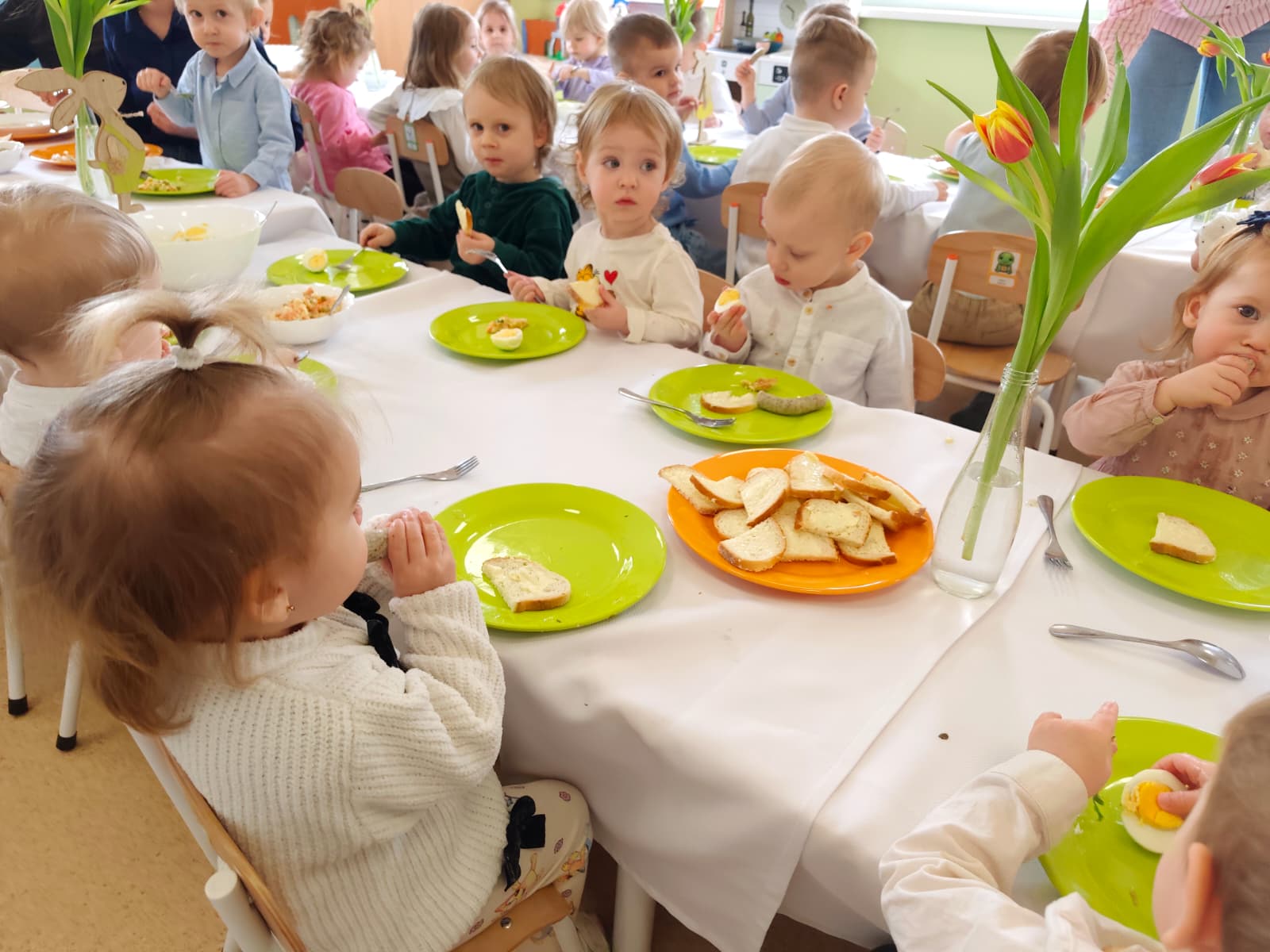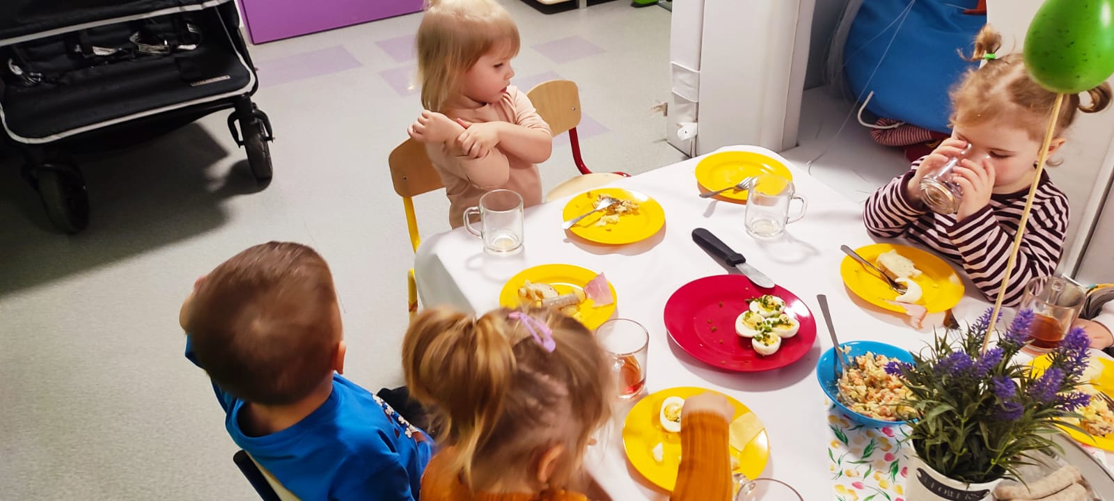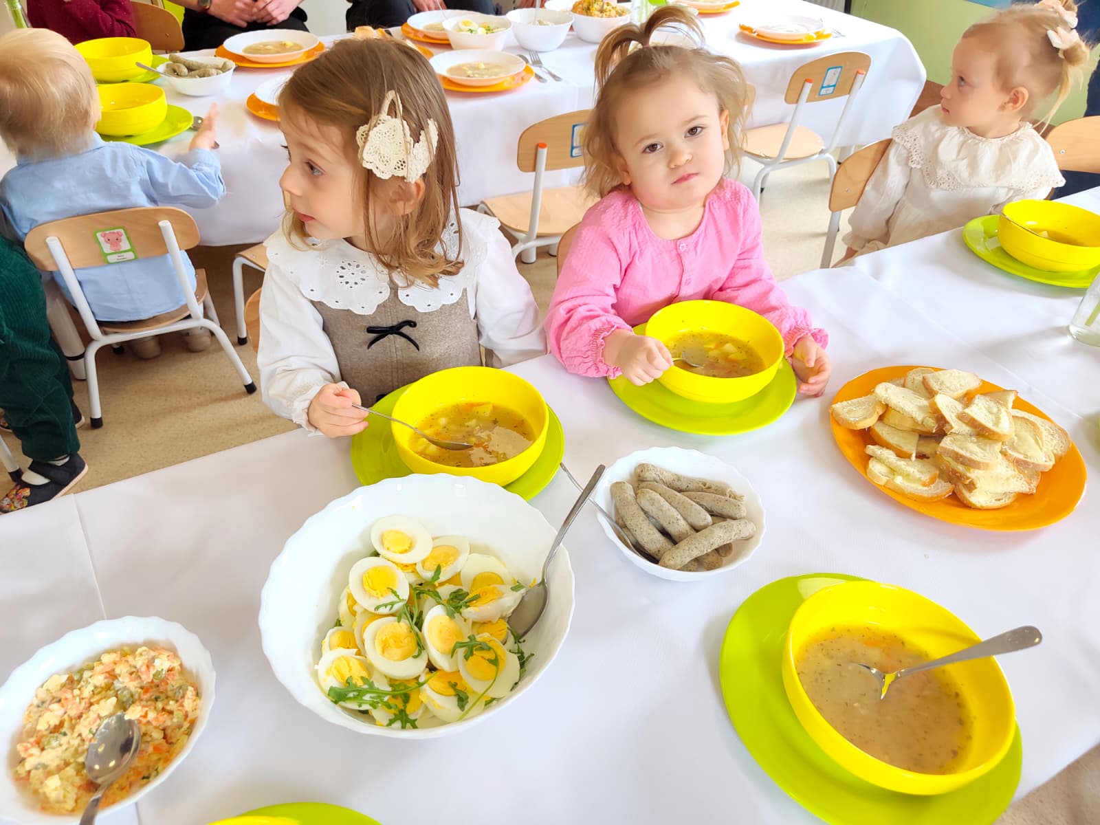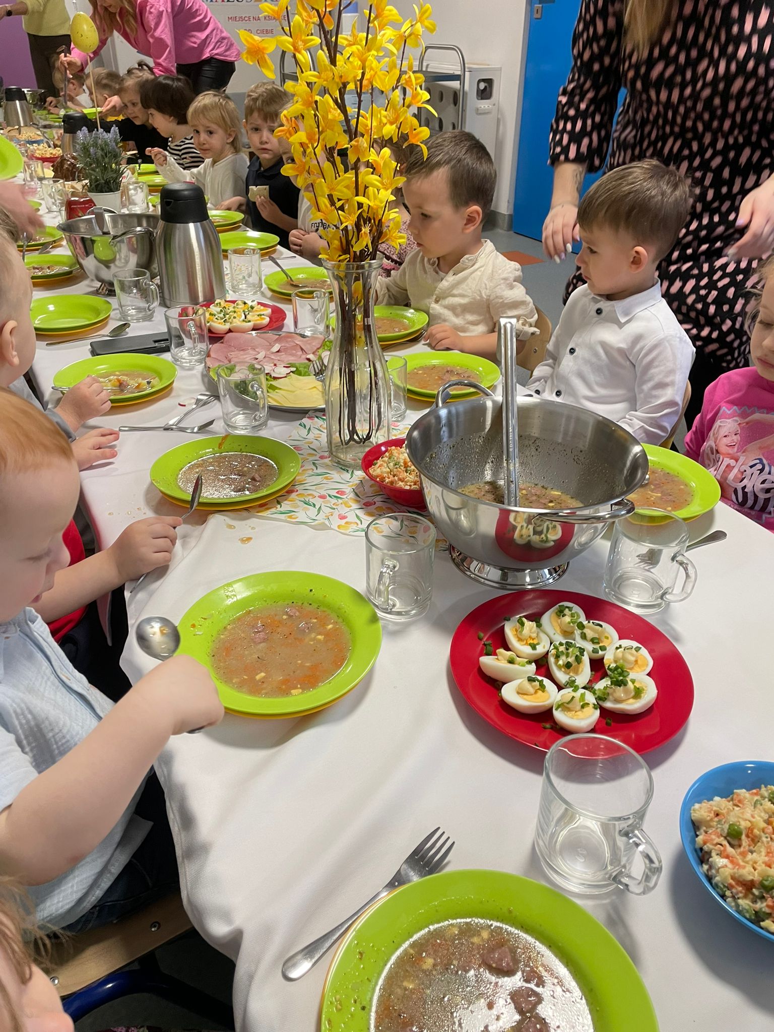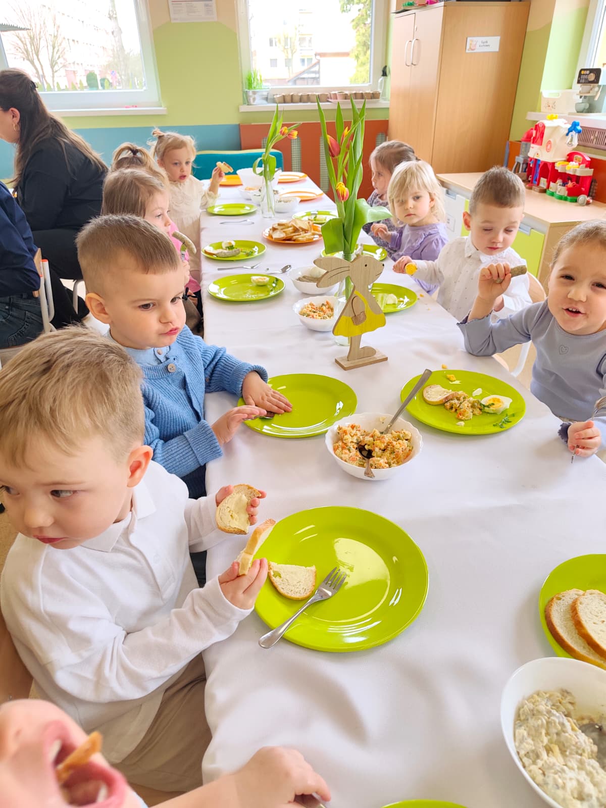 W dniach poprzedzających Święta Wielkanocne w naszym żłobku panowała wyjątkowa, radosna atmosfera, pełna tradycji i wspólnego świętowania. 31 marca odbyło się uroczyste śniadanko oraz obiad wielkanocny. Na stołach pojawiły się tradycyjne potrawy – od aromatycznego żurku po słodką, wielkanocną babkę. Dzieci miały okazję spróbować świątecznych smaków, a także wspólnie spędzić czas przy pięknie udekorowanych stołach, ucząc się przy tym wielkanocnych zwyczajów.